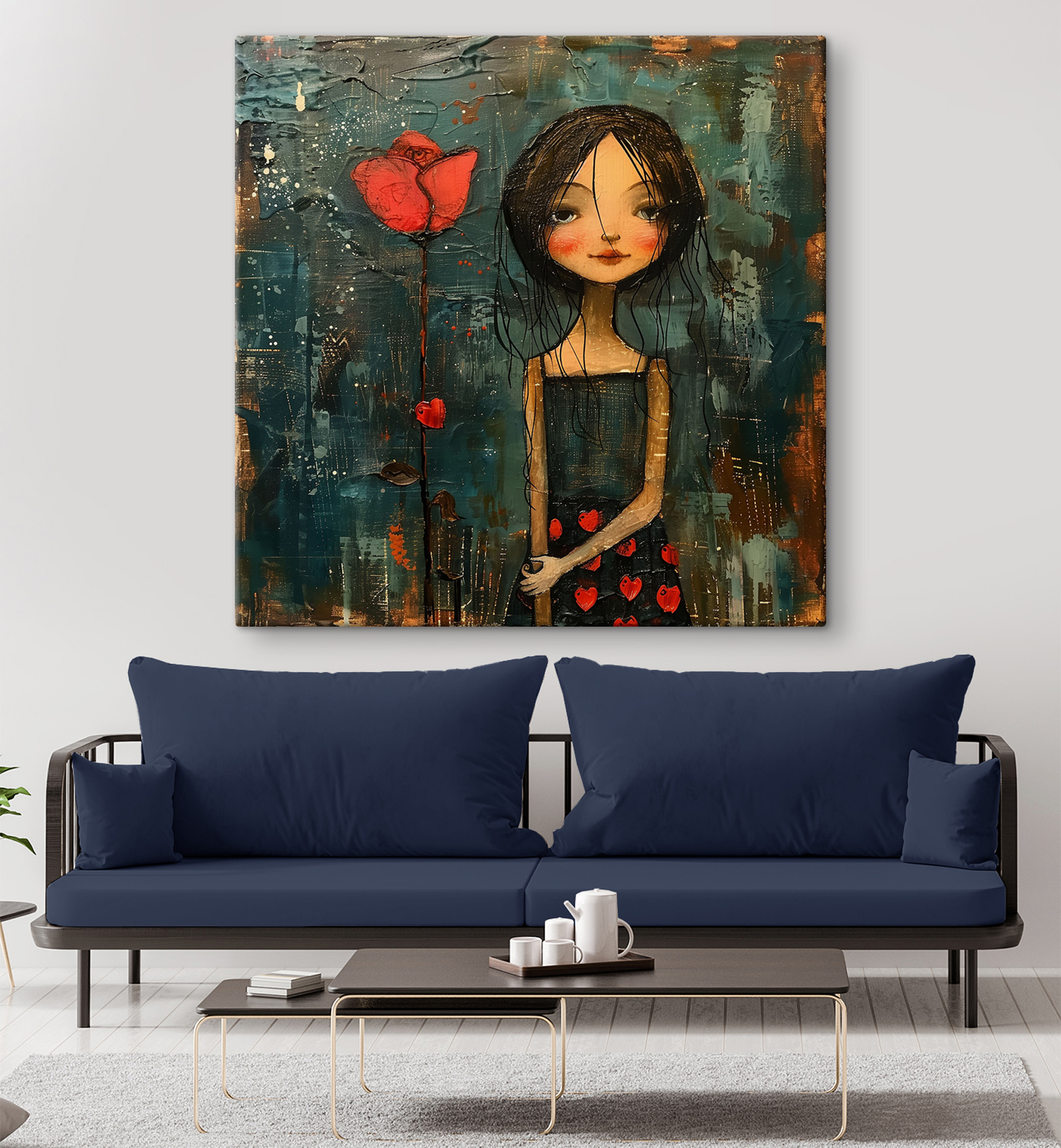 Imaginez que vous rentriez chez vous après une longue journée et que vous ayez envie d’un coin douillet pour vous détendre. Cette magnifique impression sur toile pourrait bien être ce qu’il vous faut ! Cette peinture rêveuse d’une jeune fille tenant une fleur est doucement magique, comme si l’on entrait dans un conte de fées. Ses couleurs vibrantes – ces bleus profonds et ces touches de rouge – suffisent à donner à n’importe quel espace l’impression d’avoir un cœur. Il est parfait pour tous ceux qui aiment l’art avec une touche de fantaisie. Imaginez-la au-dessus de votre coin lecture, ajoutant une touche de charme et beaucoup de chaleur.
