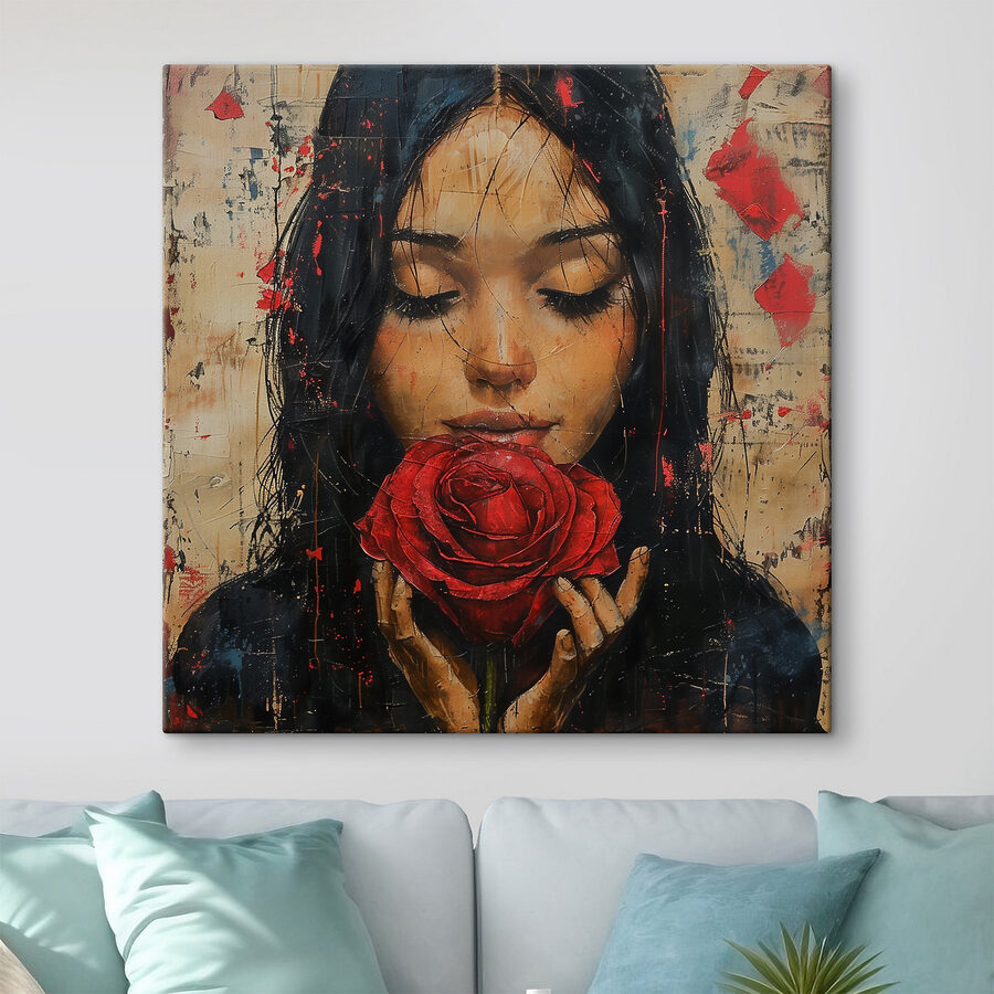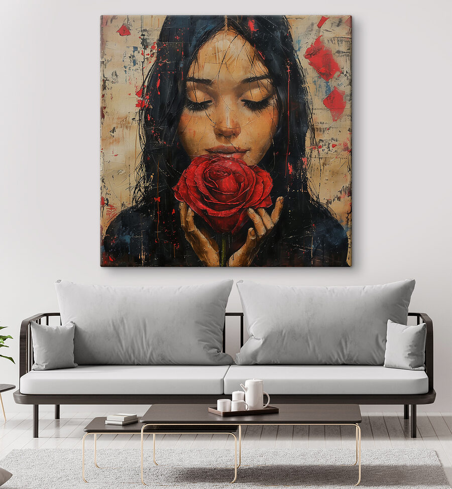 Voici une toile qui respire l’élégance. Il s’agit d’une peinture représentant une femme serrant amoureusement une rose rouge. Imaginez-la dans votre salon – vos amis pourraient bien s’arrêter en plein milieu d’une phrase, fascinés par son attrait. La façon dont le rouge profond de la rose ressort, c’est comme si la fleur s’épanouissait directement sur la toile. Parfait pour tous ceux qui aiment l’art qui raconte une histoire, combinant le mystère des gens avec la beauté intemporelle des fleurs. Il pourrait susciter de douces rêveries à chaque fois que vous le regardez, vous entraînant dans son monde floral paisible.