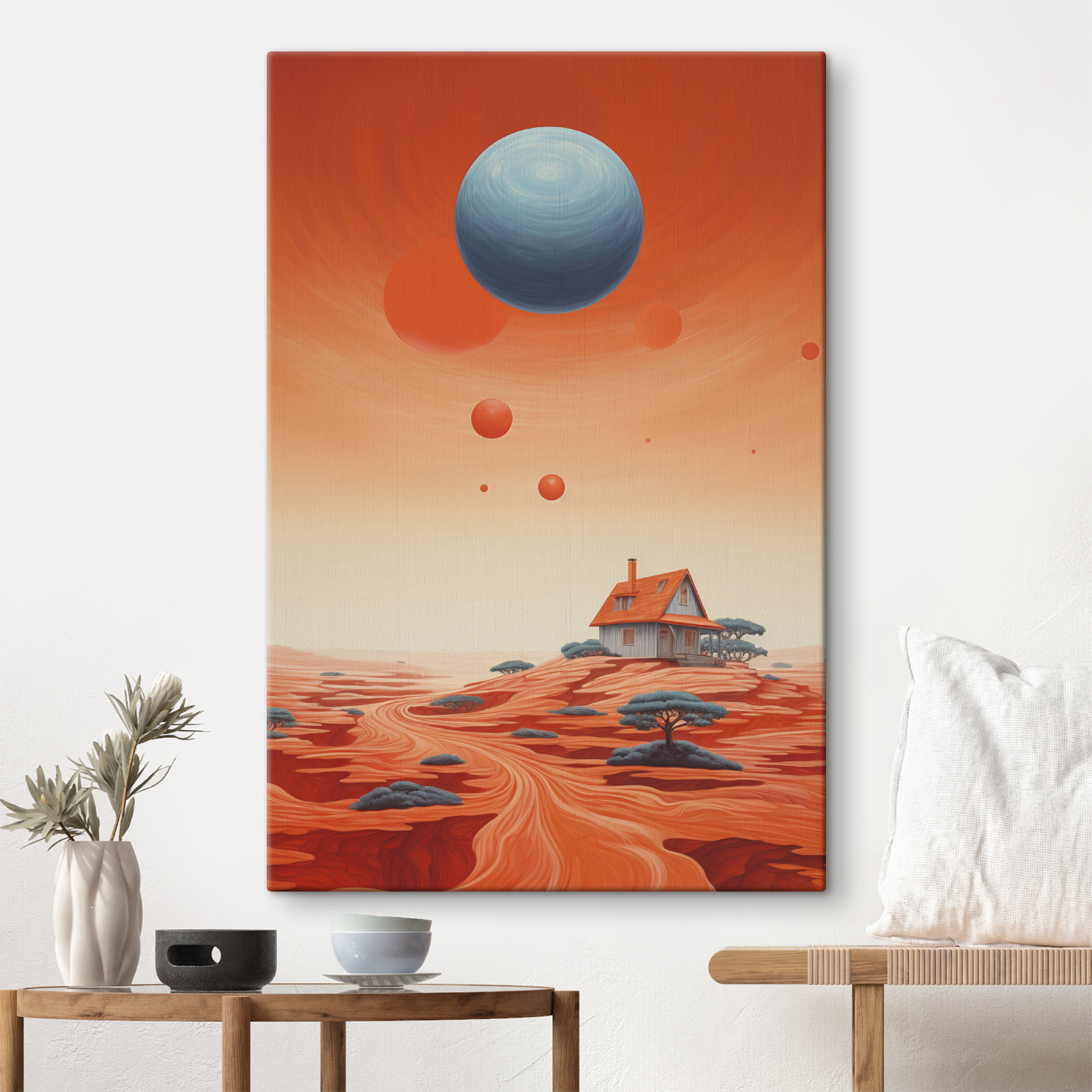 Imaginez une maison confortable nichée dans un vaste paysage désertique, entourée de rouges riches et tourbillonnants et de planètes étranges flottant au-dessus d’elle. Cette impression sur toile est comme une petite tranche d’imagination, vous invitant à pénétrer dans un monde de rêve où l’aventure vous attend. Accrochez-la dans votre salon et, soudain, chaque réunion deviendra un voyage. Les invités se demanderont peut-être même s’ils ne devraient pas faire leurs valises pour s’évader ! C’est un sujet de conversation parfait, mêlant une touche de fantaisie à un soupçon de sérénité. Cette œuvre d’art transforme un mur de basique à “wow”. Qui aurait cru que la décoration pouvait avoir autant de personnalité ?