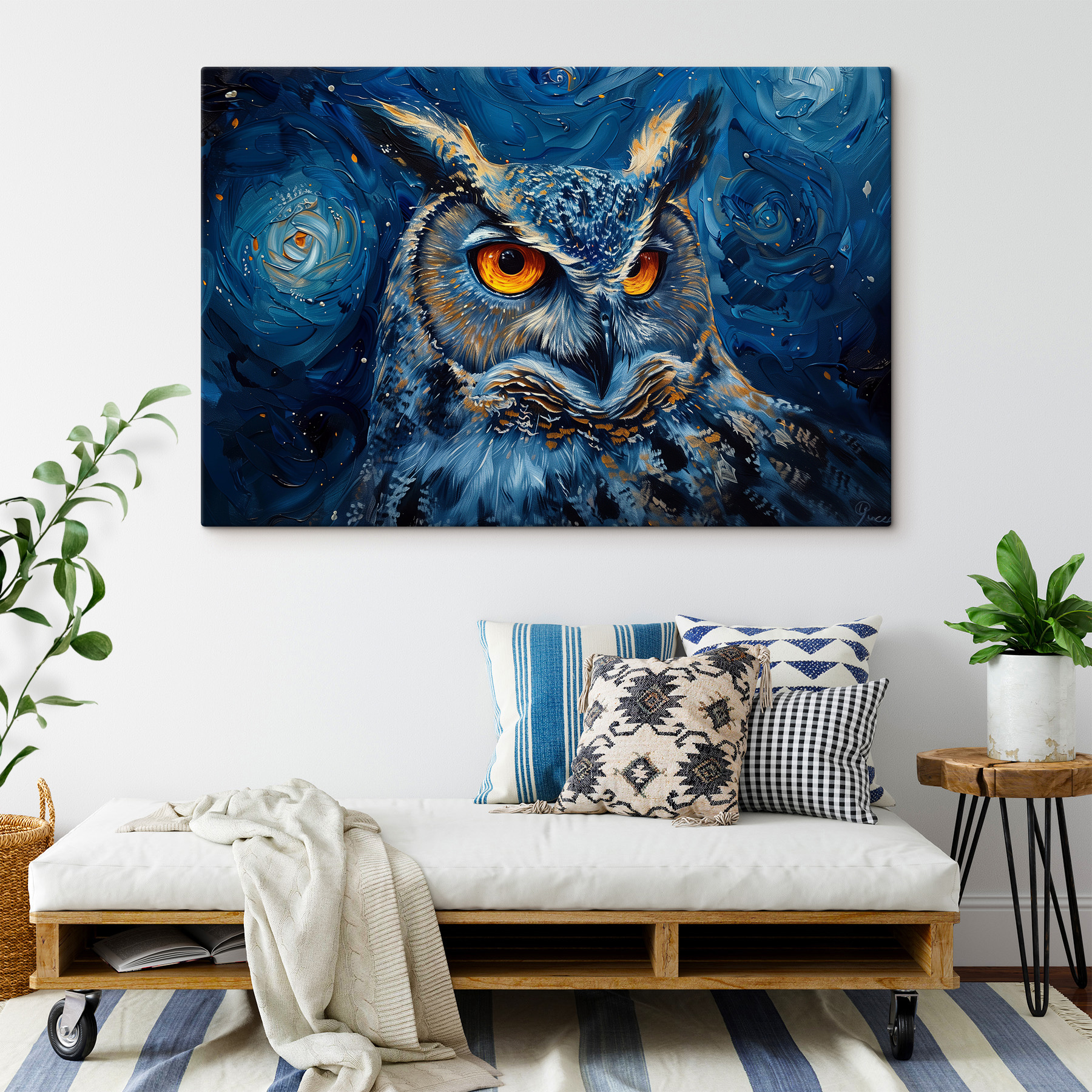 Imaginez : un hibou aux yeux si orangés qu’ils brillent pratiquement, prêt à ajouter une touche de mystère à votre espace. Cette impression sur toile ne se contente pas d’être suspendue, elle vous raconte des histoires à chaque fois que vous lui jetez un coup d’œil. Parfaite pour tout amateur d’animaux ou d’art, c’est comme si un vieil ami sage veillait sur votre chambre. Ces tourbillons bleus de rêve font ressortir le hibou, comme s’il était en plein vol ! Accrochez-le et les gens ne pourront s’empêcher d’y regarder à deux fois – de plus, il ne manquera pas d’alimenter les conversations. Allez-y, apportez un peu d’enchantement dans votre maison !