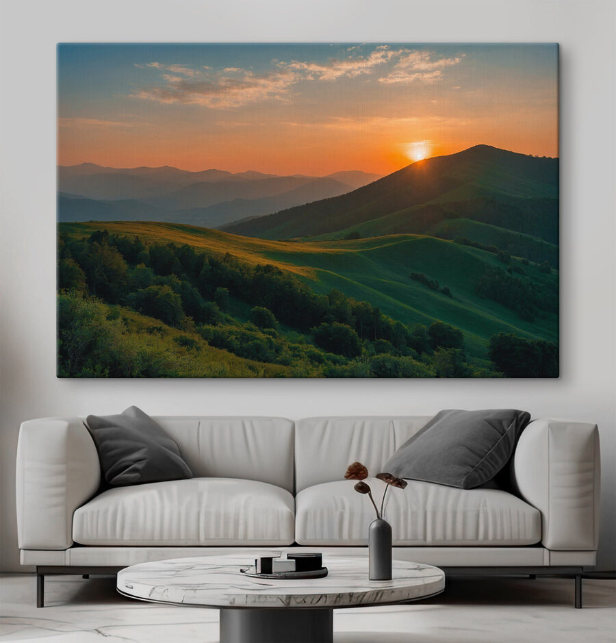 Imaginez que vous contempliez cette toile tous les jours – c’est comme si vous faisiez une escapade personnelle sans quitter votre maison. Cette impression “Coucher de soleil sur une colline verdoyante” n’est pas seulement de l’art, c’est aussi une source d’inspiration instantanée. Le mélange d’oranges chauds et de verts apaisants vous fait penser aux soirées d’été paresseuses, où le temps ralentit. Parfait pour toute pièce qui a besoin d’une touche de magie de la nature. Accrochez-le là où vous sirotez votre café du matin ou vous détendez après une longue journée. Il ne manquera pas de susciter un ou deux sourires, voire des rêves.