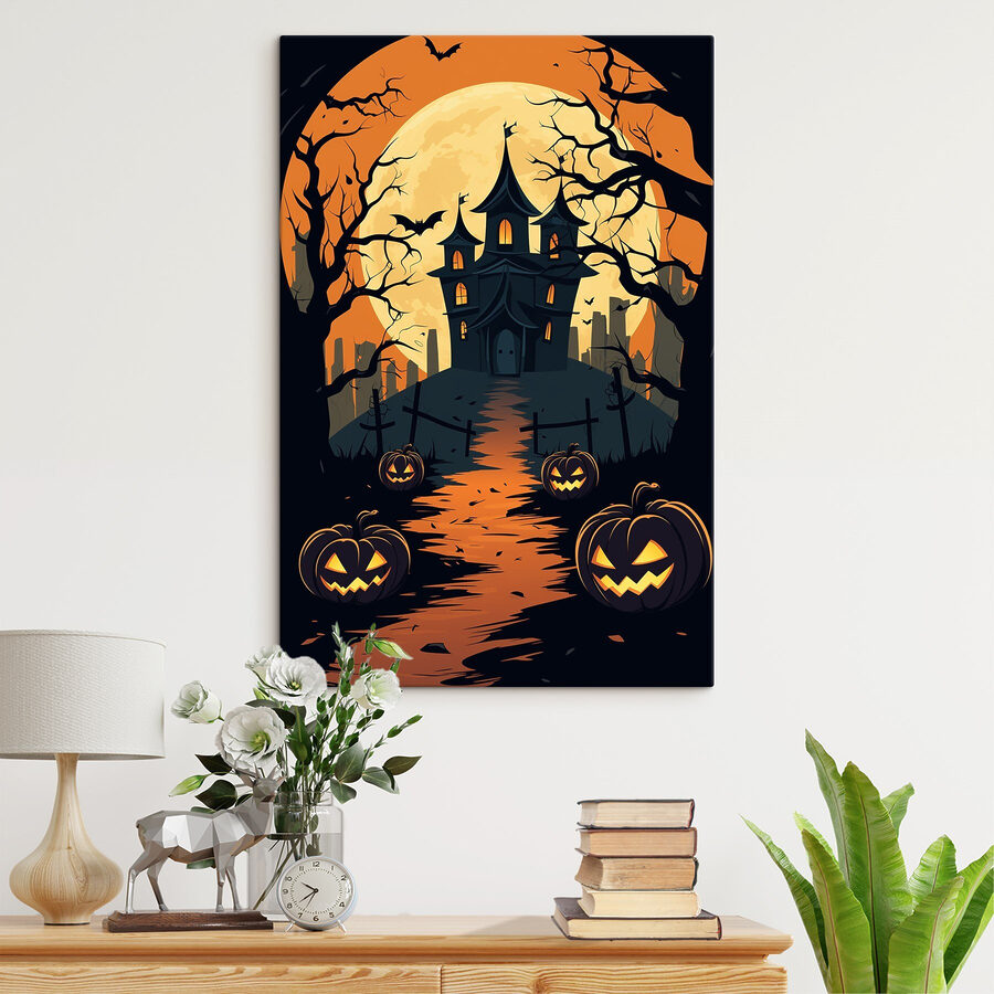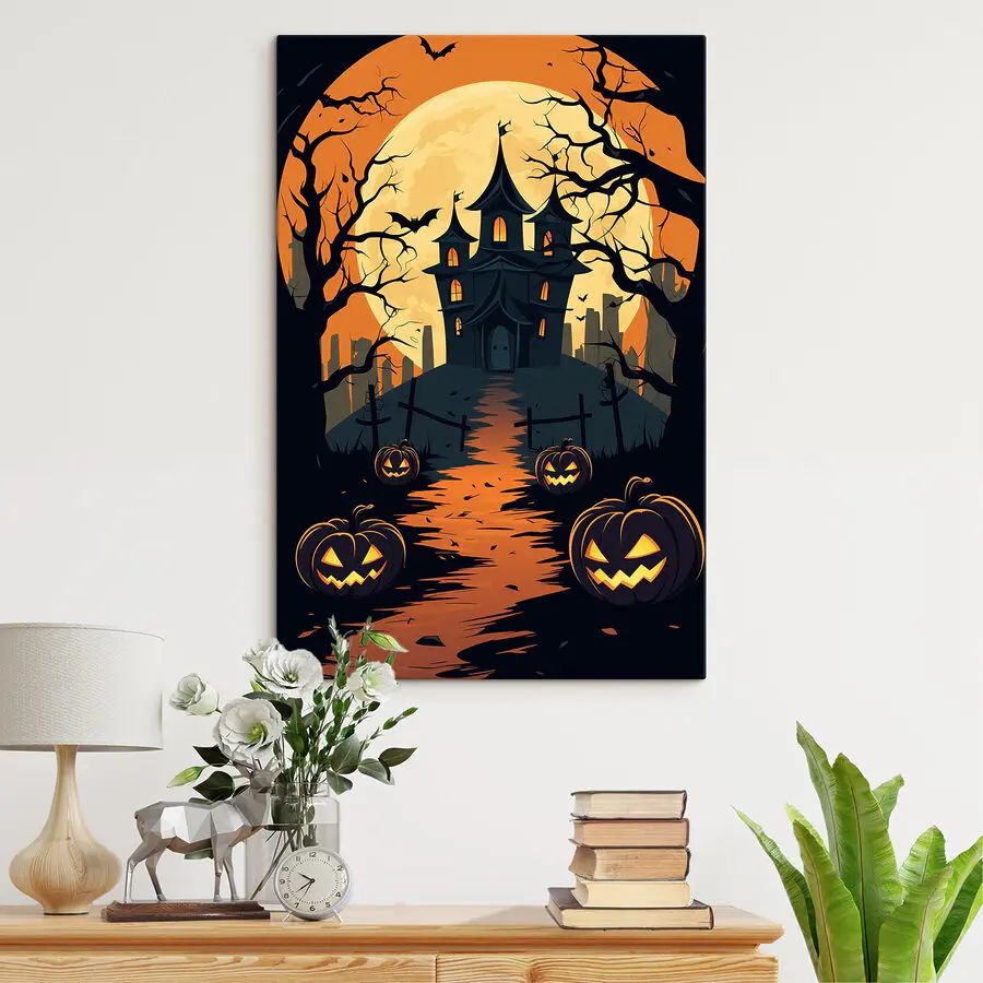 Imaginez que vous apportiez une touche de fantaisie et une pincée d’effroi à votre espace avec cette impression sur toile pleine de vie ! Avec une maison de dessin animé, des citrouilles effrontées et des arbres tortueux sous une pleine lune brillante, c’est comme si la carte postale préférée d’Halloween prenait vie sur votre mur. Parfait pour ajouter de la personnalité, et avouons-le, qui ne sourit pas à la vue d’un spectacle aussi charmant et sinistre ? Vos amis pourraient même se mettre à chercher des fantômes cachés (spoiler : ils sont imaginaires). C’est la nature qui rencontre le malheur, de la manière la plus chaleureuse qui soit !