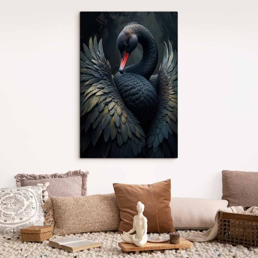 Transformez votre espace avec le superbe “Tableaux Black Swan with a Red Beak” (Impression sur toile – Cygne noir au bec rouge). Cette pièce n’est pas seulement une décoration, c’est une déclaration. Imaginez : un magnifique cygne noir au bec rouge audacieux, posant gracieusement au milieu de textures feuillues qui semblent prendre vie. C’est comme s’il vous invitait à discuter de l’élégance de la nature.