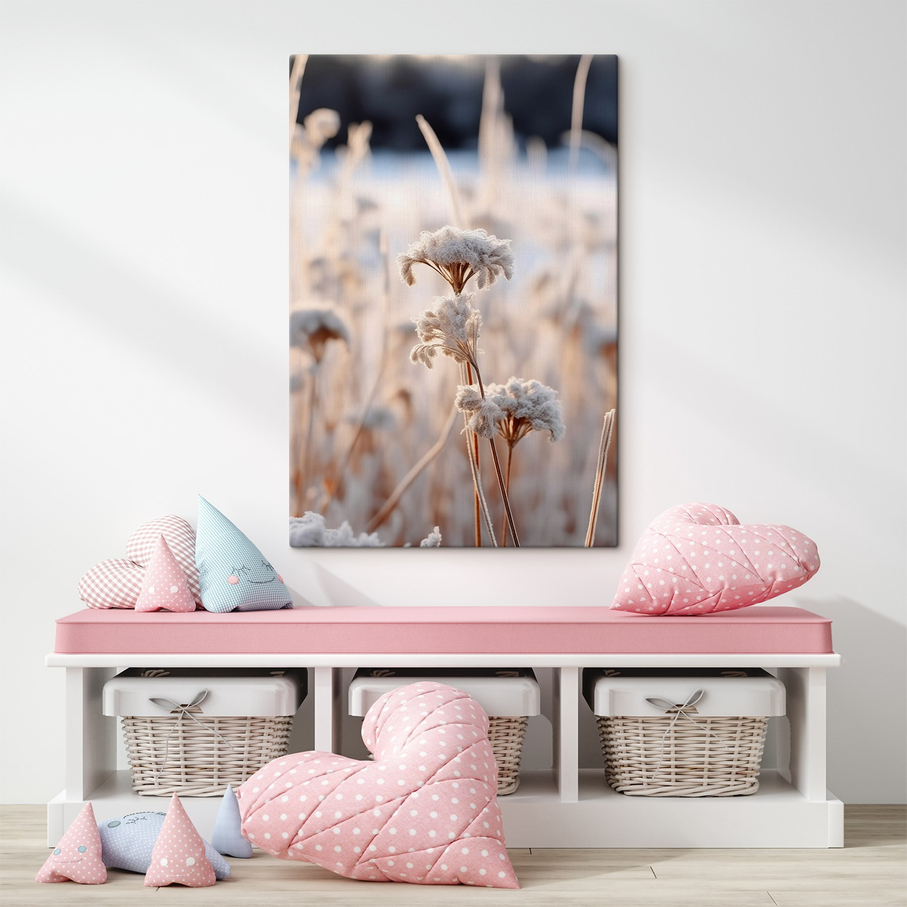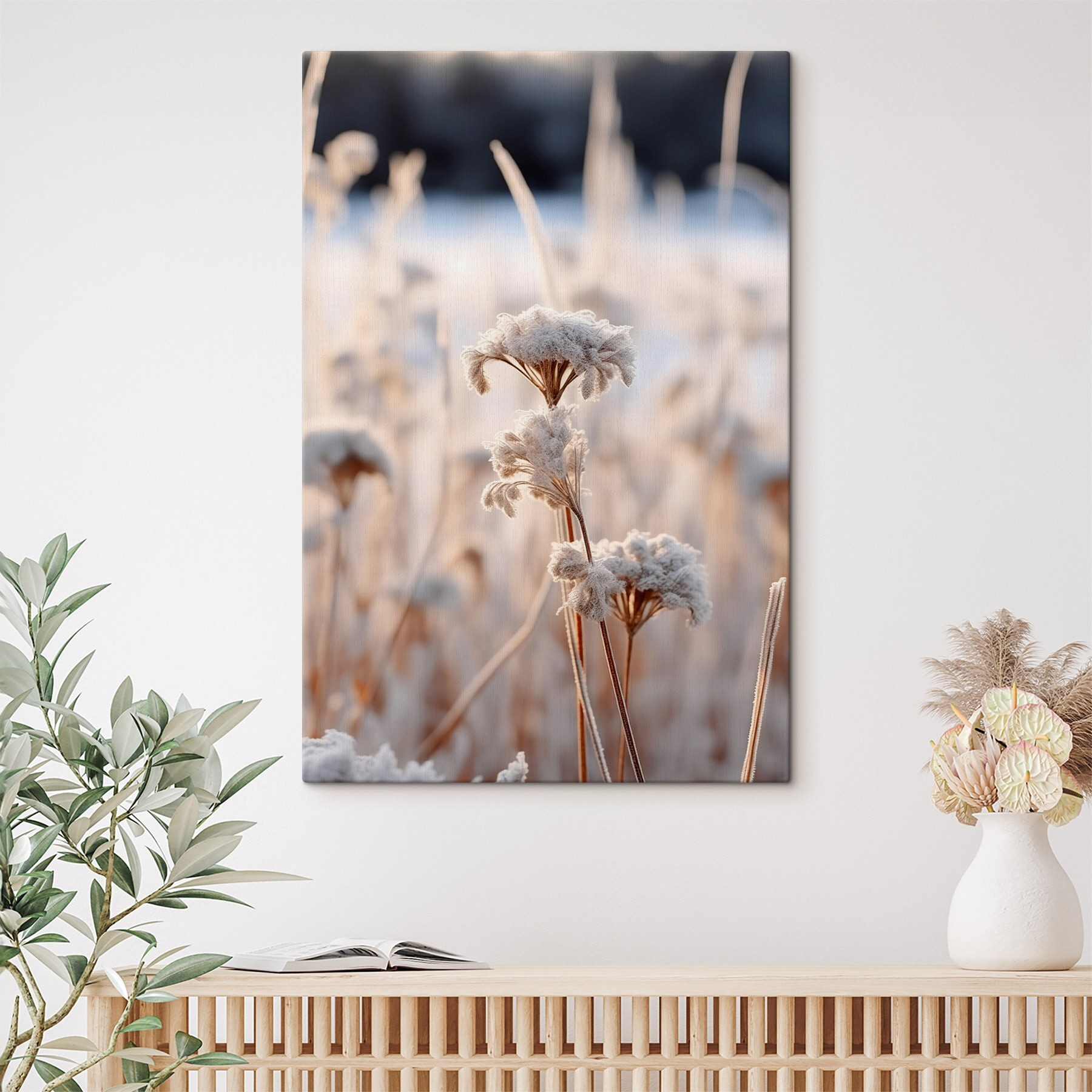“Winter Whispers in Frosted Blooms” (murmures d’hiver dans des fleurs givrées) apporte une douce atmosphère d’élégance hivernale dans votre salon. Imaginez-vous en train de vous réchauffer avec un chocolat chaud pendant que cette superbe toile capture les délicates fleurs givrées qui dansent dans une douce brise. C’est comme un murmure serein de la nature elle-même, parfait pour tous ceux qui rêvent de matins enneigés tranquilles sans les orteils froids. Cette pièce n’est pas seulement un décor ; c’est une ambiance, un moment, une bouffée d’air frais et frisquet qui donne à votre espace un air à la fois paisible et chic. Idéal pour les amoureux de la nature et les rêvasseurs.