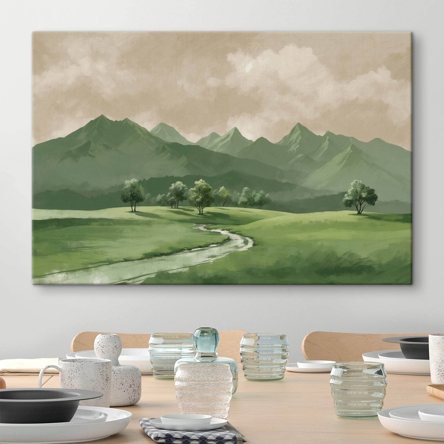 Imaginez que vous pénétrez dans une vallée sereine, où une douce rivière serpente à travers une végétation luxuriante, flanquée de montagnes majestueuses. Cette impression sur toile capture parfaitement cette essence, apportant une bouffée d’air frais à n’importe quel espace. C’est comme si vous aviez un petit morceau de nature sur votre mur – pas besoin de chaussures de randonnée !