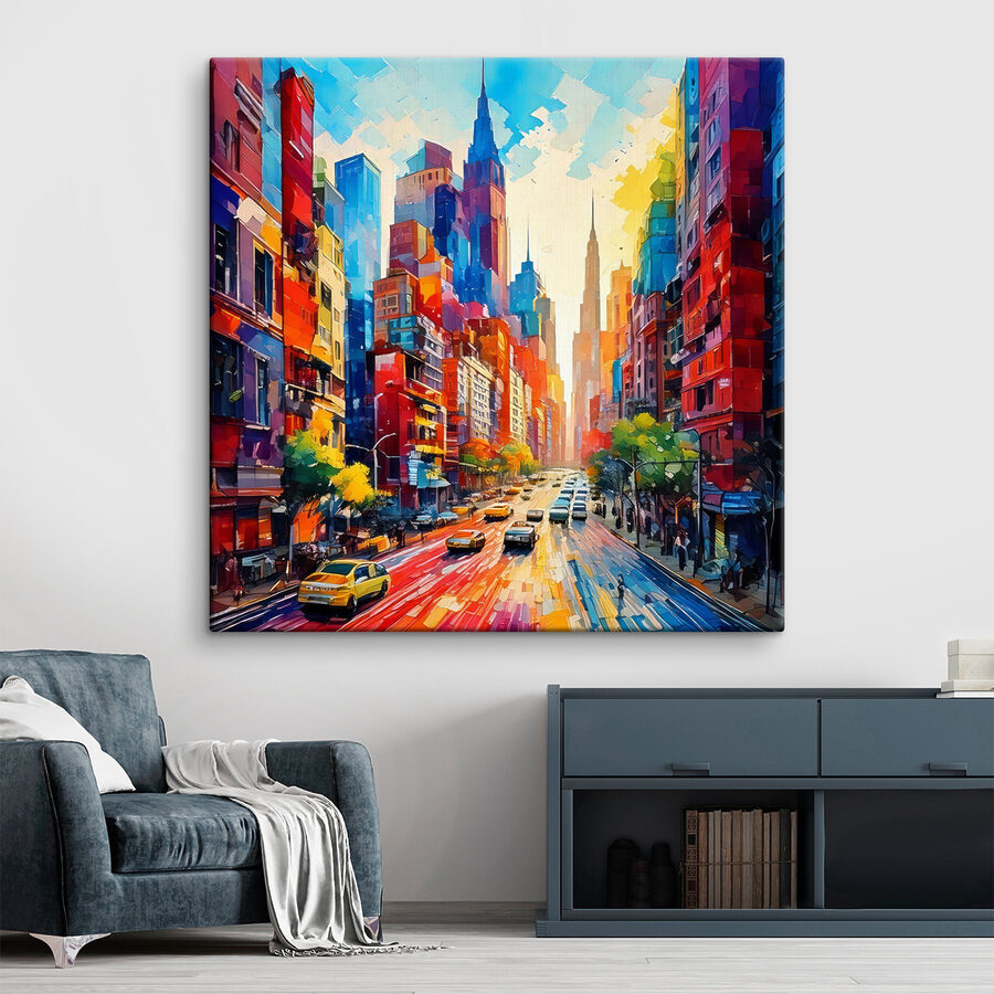 Imaginez cela sur votre mur : une rue de ville animée, pleine d’énergie, de voitures et d’immeubles imposants peints dans un kaléidoscope de couleurs. C’est comme si vous aviez un petit morceau de magie urbaine chez vous. Parfait pour les rêveurs qui aiment que leur décor soit aussi vivant que leur café du matin. Ressentez l’effervescence de la ville sans le chaos des klaxons. Installez-vous dans votre canapé, laissez vos yeux se promener dans les rues et imaginez une vie où l’aventure vous attend à chaque coin de rue. Pas besoin de carte, il suffit d’aimer les paysages urbains qui parlent à l’âme.