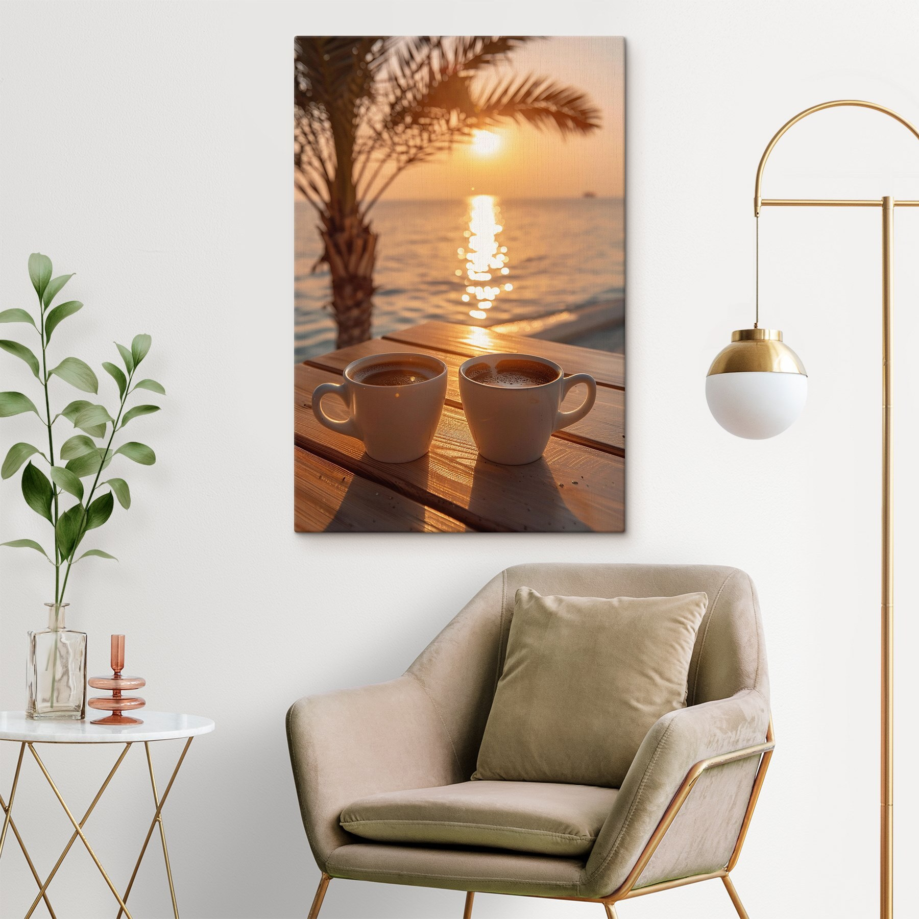 Imaginez que vous vous réveillez avec la douce lueur du lever de soleil sur l’océan et deux tasses de café fumantes qui n’attendent que d’être dégustées. Cette impression sur toile capture ce moment parfait de tranquillité, où le temps semble ralentir. C’est comme si vous aviez des mini-vacances sur votre mur, invitant à des discussions tranquilles ou à des rituels matinaux apaisants. Les doux reflets sur l’eau ajoutent une touche de rêve, rendant tout espace confortable et accueillant. Parfait pour un amateur de café ou toute personne souhaitant une touche de sérénité à la maison. Qui ne voudrait pas s’attarder dans cette scène un peu plus longtemps ?