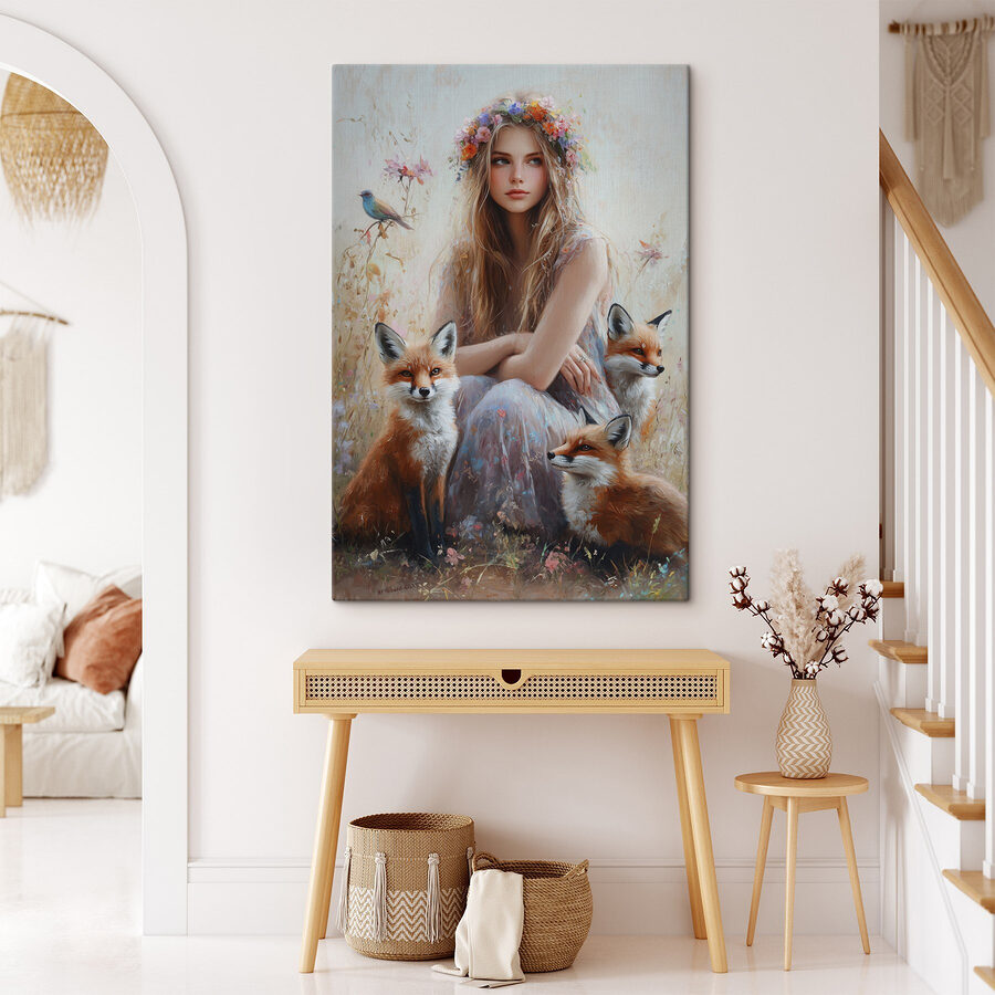 Entrez dans un monde fantaisiste avec cette superbe impression sur toile, représentant une femme sereine enveloppée dans l’étreinte de la nature aux côtés de charmants renards. Les pastels doux et les fleurs vibrantes créent une toile de fond de rêve qui semble être un doux câlin pour vos murs. Imaginez ce tableau dans un coin lecture confortable ou dans un couloir baigné de lumière, il illumine instantanément l’espace. C’est comme si vous invitiez un peu de magie des contes de fées dans votre maison. De plus, qui ne voudrait pas d’un trio d’adorables renards pour lui tenir compagnie ? Ils rayonnent pratiquement de chaleur et de curiosité. Parfait pour ceux qui apprécient la beauté de la nature et une touche de fantaisie !