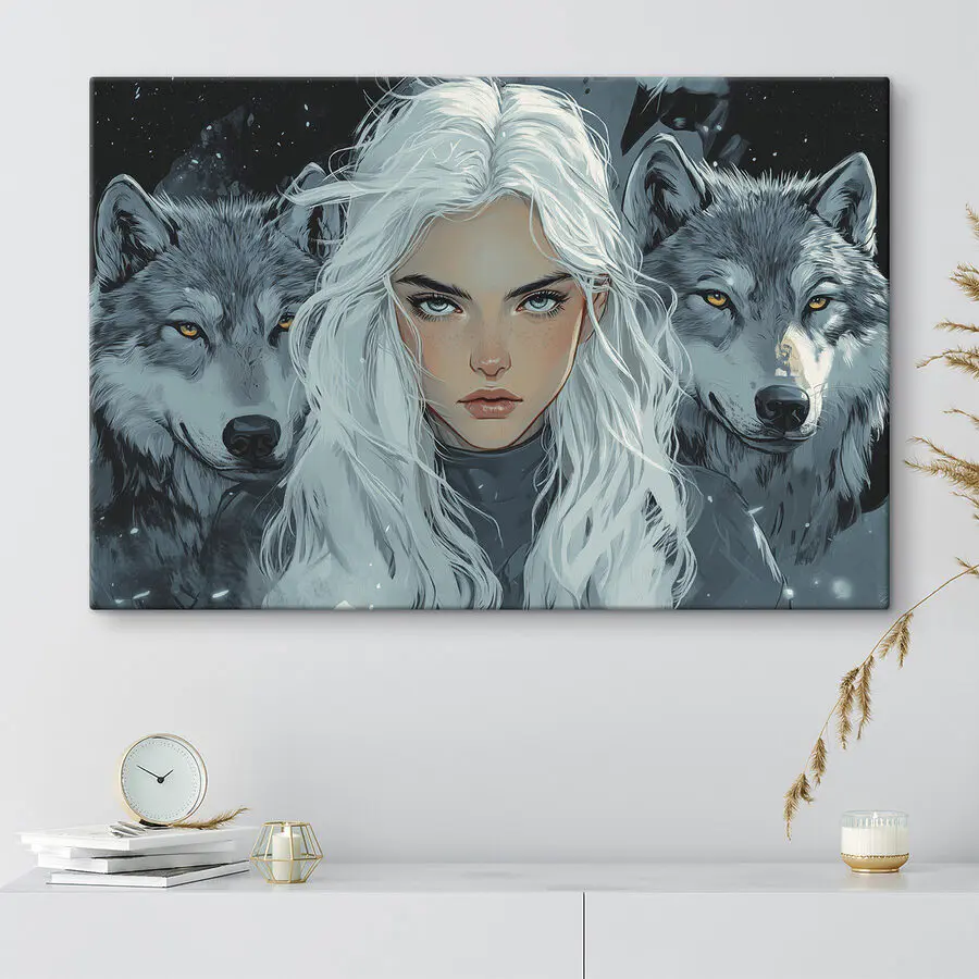 Transformez votre espace avec cette superbe impression sur toile représentant une femme féroce aux cheveux blancs flottants et deux loups vigilants à ses côtés. C’est comme si vous aviez votre propre duo de gardiens sur votre mur ! L’éclat de leurs expressions vous plonge dans un monde où force et sérénité coexistent. Imaginez que vous entrez dans la pièce et que vous ressentez une connexion électrique, comme si l’esprit sauvage de la nature chuchotait juste pour vous. Parfaite pour un coin lecture confortable ou un couloir artistique, cette pièce ne se contente pas de décorer, elle raconte une histoire – audacieuse, mystérieuse et indéniablement captivante.