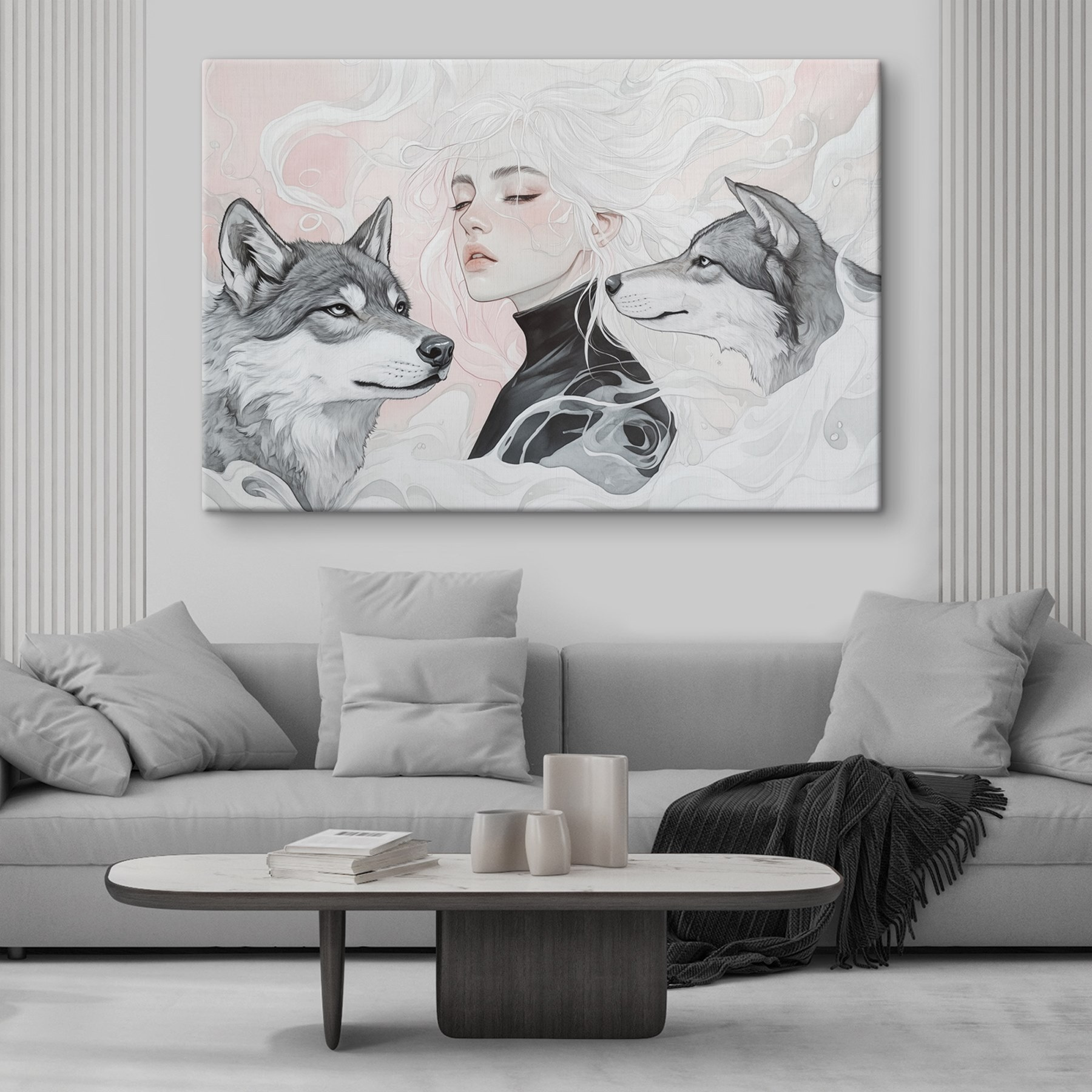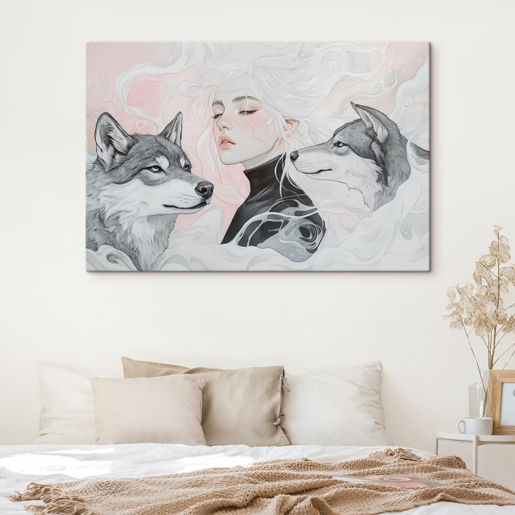 Imaginez un coin douillet dans votre maison, où la chaleur de la personnalité rencontre une touche sauvage. Cette impression sur toile d’une femme aux cheveux blancs flottants, flanquée de deux loups vigilants, ajoute une narration convaincante à n’importe quel espace. Les teintes douces créent une atmosphère invitante, chuchotant presque des secrets de la nature. L’œuvre ne se contente pas de rester là, elle interpelle tous ceux qui passent à proximité, suscitant la curiosité et peut-être même un peu de rêverie. Parfait pour un mur vide ou pour engager la conversation au-dessus du canapé, il apporte un délicieux mélange de sérénité et de force. Qui ne se sentirait pas inspiré en contemplant une œuvre aussi frappante ?