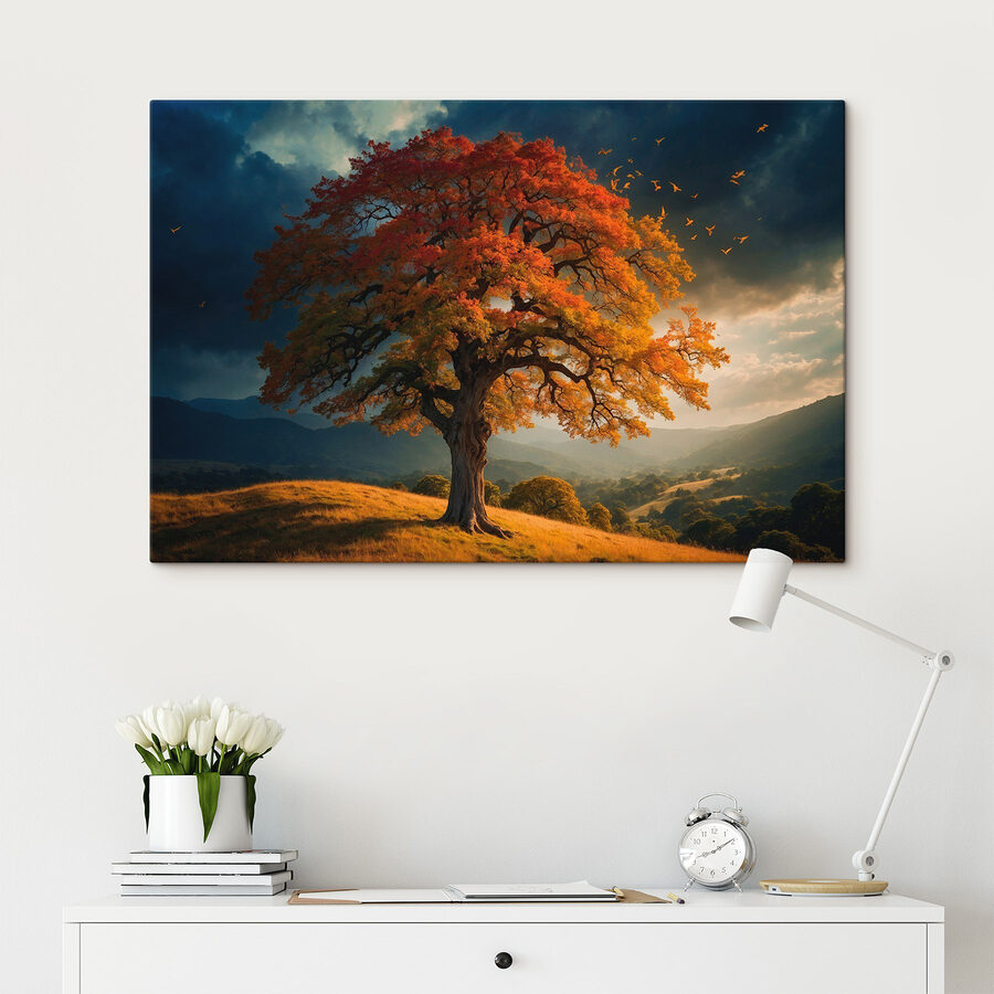 Transformez n’importe quel espace avec cette superbe impression sur toile d’un arbre majestueux drapé de feuilles orange et jaunes, se dressant fièrement sur une colline. C’est comme une étreinte chaleureuse de l’automne, apportant une explosion de couleurs et de vie à vos murs. Imaginez que vous sirotiez un café en contemplant cette œuvre vibrante, et que vous ressentiez l’ambiance chaleureuse de l’automne tout au long de l’année. Ce n’est pas seulement un décor, c’est une invitation à rêver de randonnées paisibles et de feuilles croustillantes sous les pieds. Parfaite pour n’importe quelle pièce, cette œuvre d’art dégage de la chaleur et une touche de fantaisie. Qui n’en sourirait pas ?