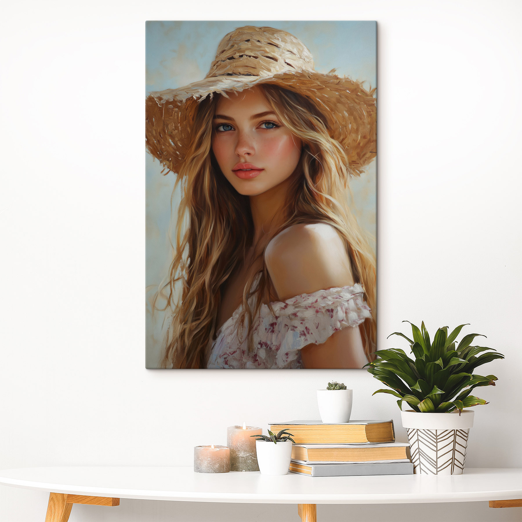 Entrez dans un monde de bonheur ensoleillé avec cette superbe impression sur toile. Représentant une femme sereine coiffée d’un chapeau de paille, cette œuvre évoque les journées d’été et les aventures insouciantes. Les couleurs douces et l’expression délicate invitent à la sérénité, ce qui en fait l’œuvre idéale pour égayer un coin douillet ou un mur d’exposition.