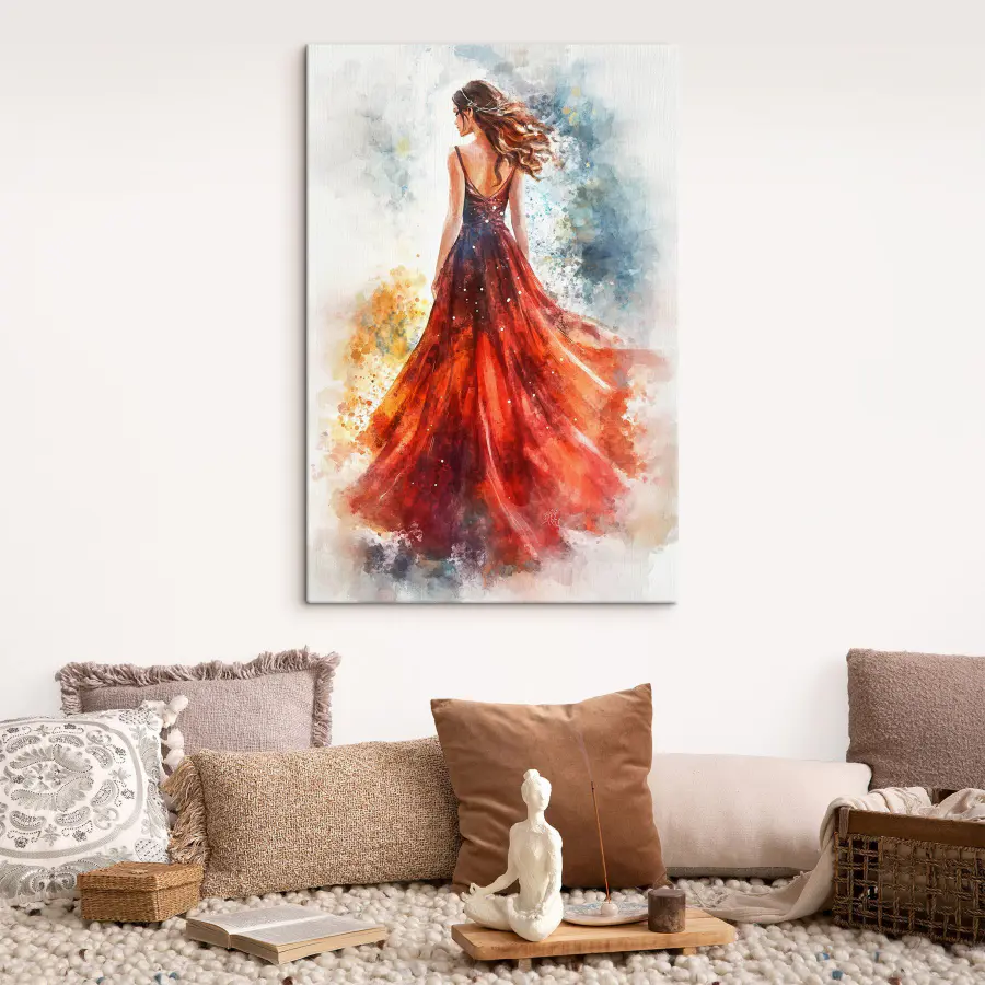 Transformez n’importe quel espace avec cette superbe impression sur toile d’une femme en robe rouge. C’est comme si elle sortait d’un rêve éveillé, capturant ce moment parfait où l’élégance se mêle à la fantaisie. Les teintes vibrantes et les doux traits d’aquarelle créent une sensation de mouvement qui semble presque vivante, ajoutant une touche de drame à vos murs.