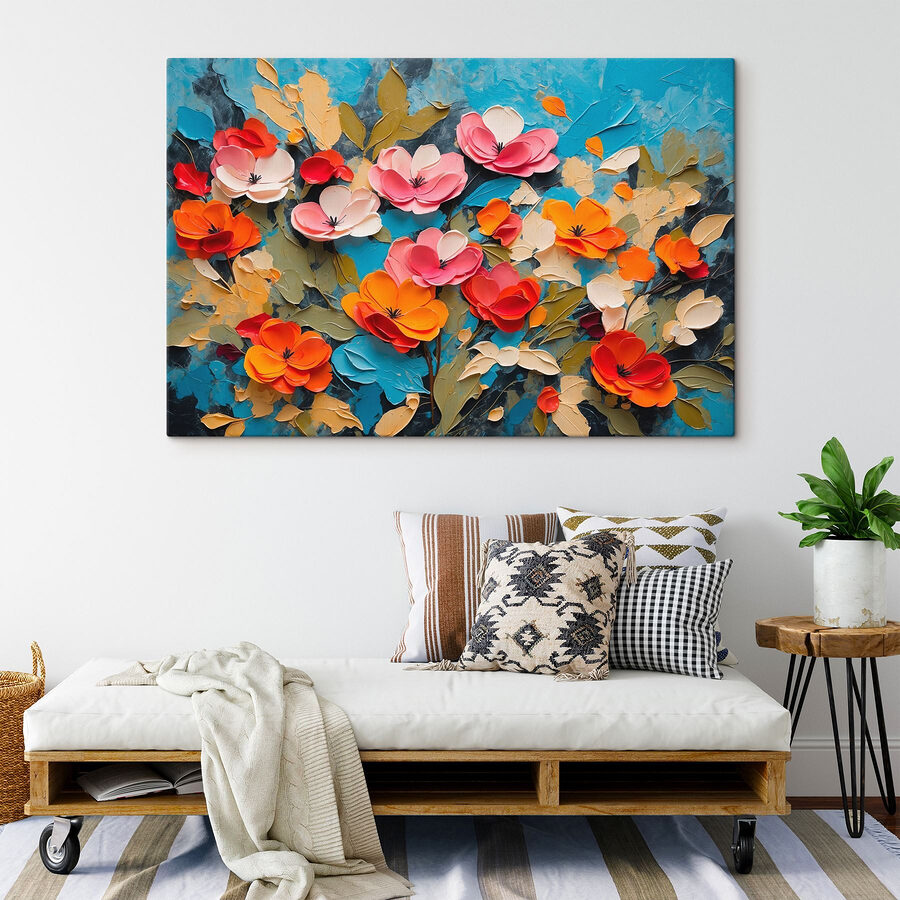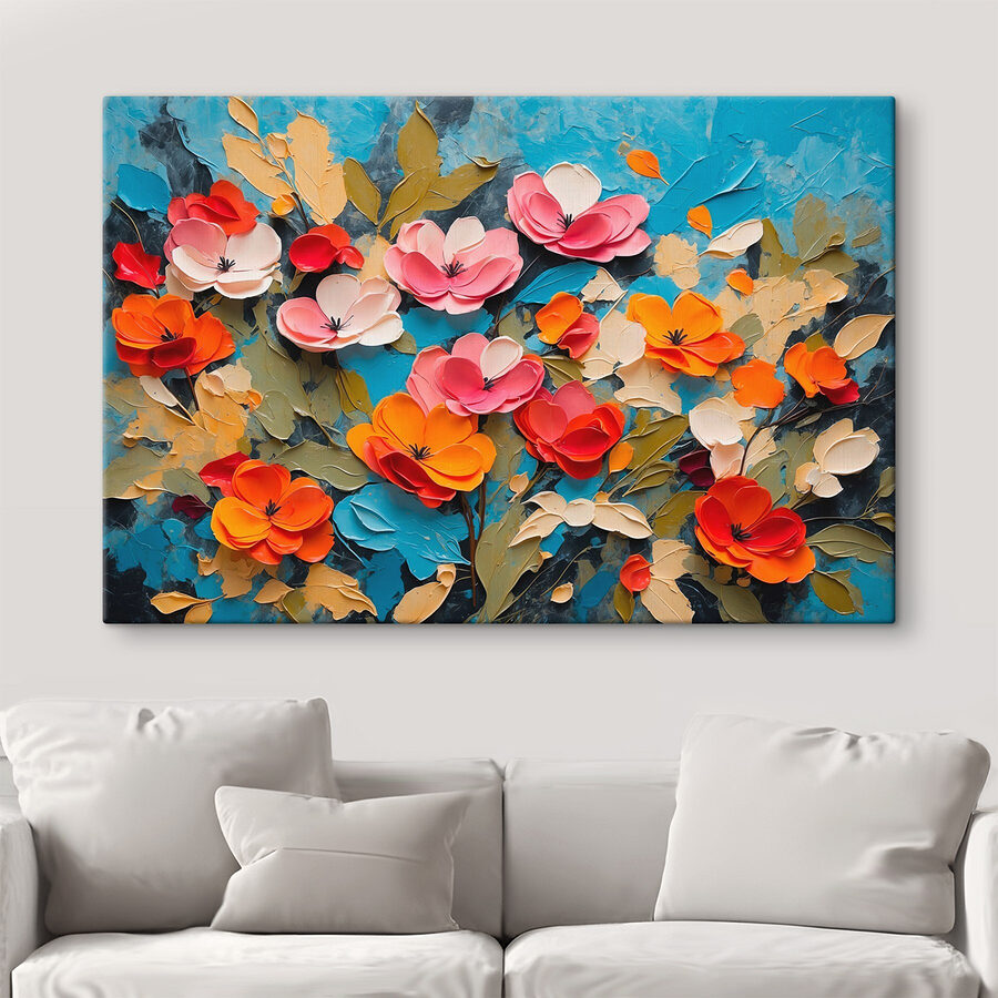 Illuminez n’importe quelle pièce avec cette superbe impression sur toile représentant des fleurs vibrantes dansant sur un fond bleu saisissant. C’est comme si un jardin avait fait irruption sur les murs, apportant la fraîcheur du printemps à l’intérieur, sans qu’il soit nécessaire d’avoir la main verte. Chaque fleur est pleine de personnalité – imaginez comment elle pourrait susciter de la joie dans un coin confortable ou un espace de rassemblement animé. Les amis ne manqueront pas de l’admirer, et peut-être même de sourire en connaissance de cause, comme s’ils pouvaient presque sentir l’odeur des pétales en fleur. C’est un sujet de conversation, une source de bonheur, parfait pour ceux qui apprécient l’art vivant et un peu ludique. Un must pour les amoureux des fleurs !