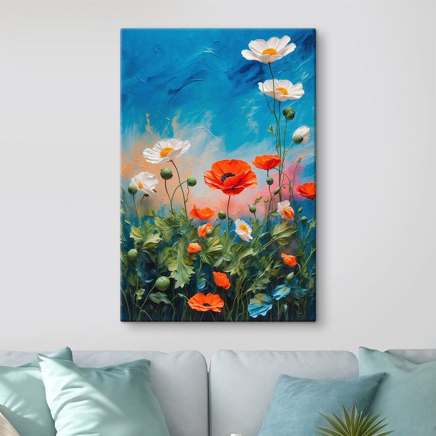 Illuminez n’importe quelle pièce avec cette superbe impression sur toile, “Impression sur toile Peinture de fleurs sur fond bleu”. Imaginez que vous entrez dans votre espace et que vous êtes accueilli par ces fleurs vibrantes, se balançant joyeusement sur un fond bleu de rêve. C’est comme si vous faisiez entrer un jardin à l’intérieur, le pollen en moins !