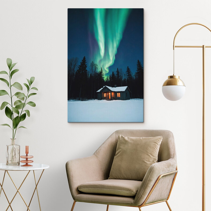 Imaginez que vous vous blottissez dans une chaleureuse cabane en bois alors que le monde extérieur est enveloppé d’un manteau de neige. Cette superbe impression sur toile capture cette nuit d’hiver parfaite, avec la danse magique des lumières vertes tourbillonnant dans le ciel. C’est comme si la nature vous offrait un spectacle de lumières, juste au-dessus de votre refuge de rêve. Qu’il s’agisse d’un feu crépitant ou d’un chocolat chaud à siroter, cette œuvre d’art invite ces sensations douillettes dans n’importe quelle pièce. Ce n’est pas seulement une décoration ; c’est une tranche de tranquillité qui murmure des histoires de nuits paisibles et de rêves étoilés. Parfait pour tous ceux qui cherchent à s’évader un peu de l’agitation quotidienne !