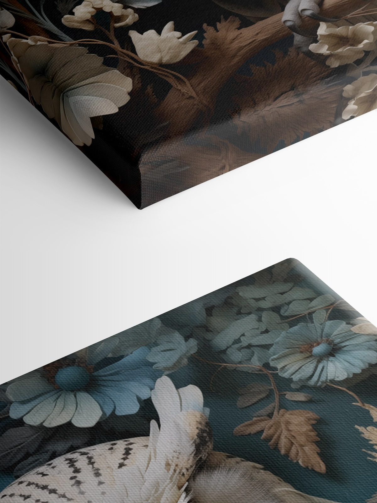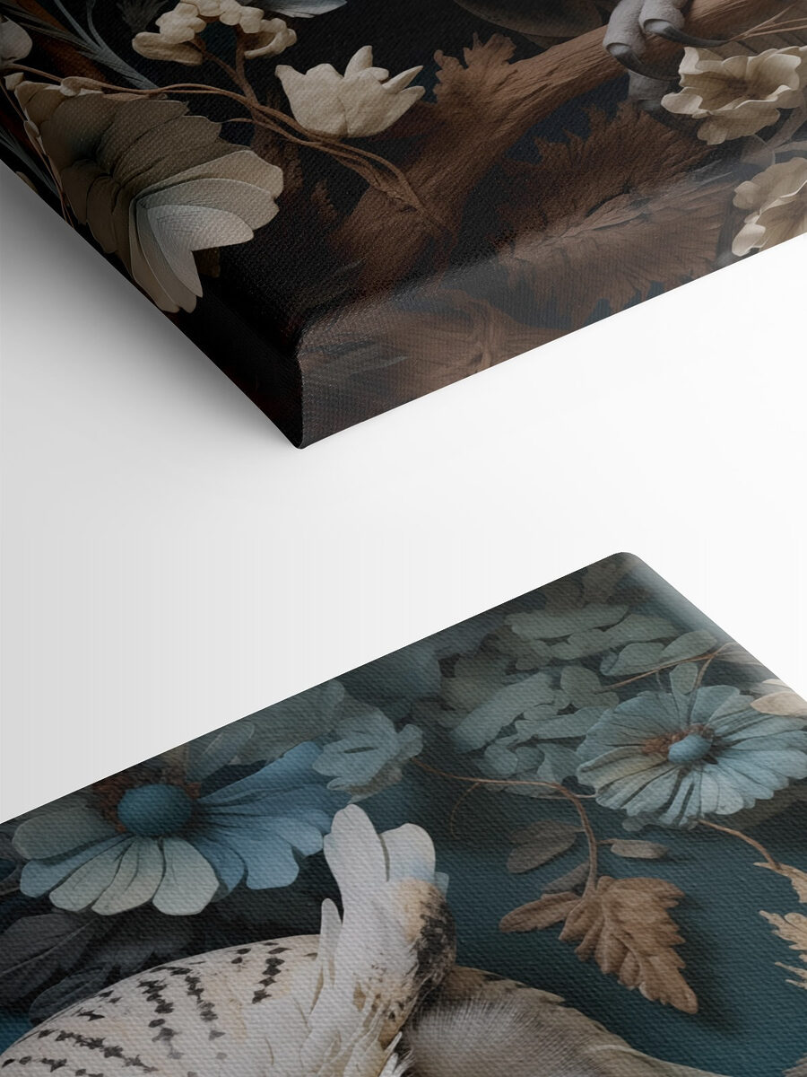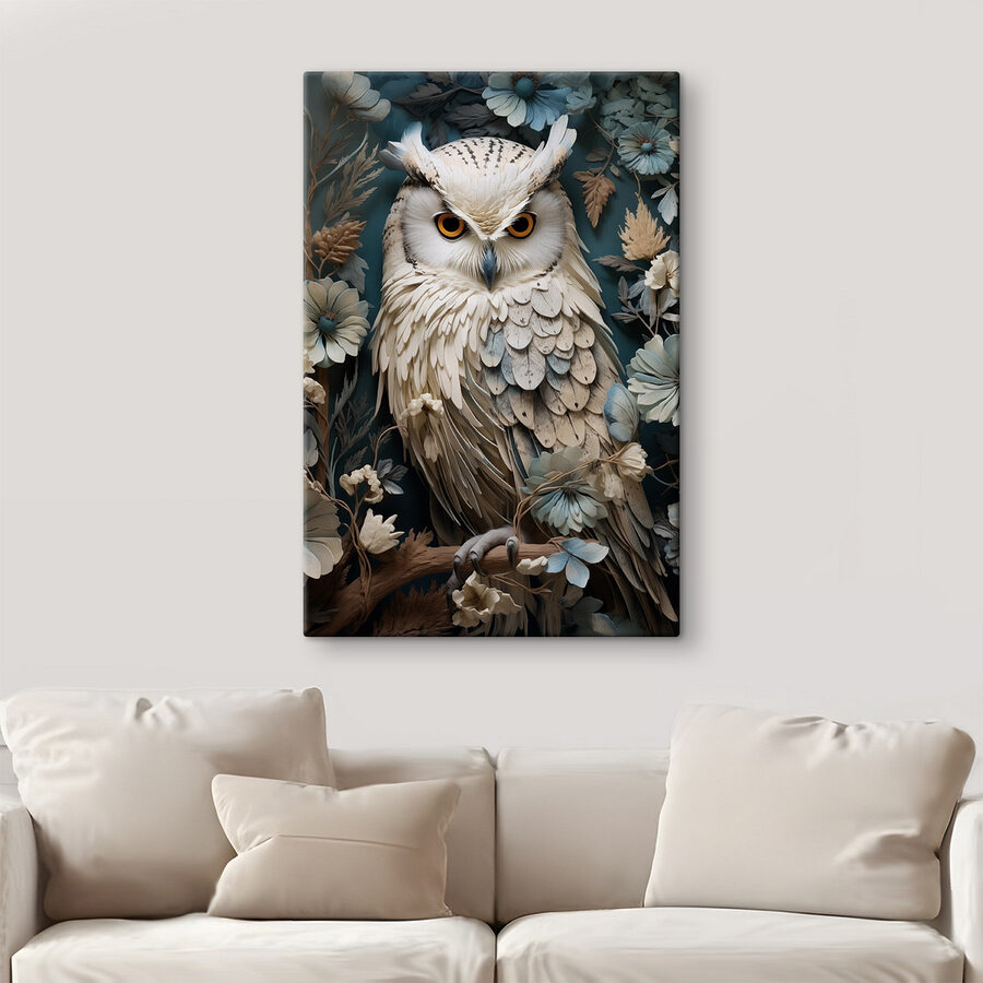 Voici une superbe impression sur toile représentant un sage hibou blanc aux yeux jaunes, perché au milieu de délicates fleurs bleues. Imaginez-la dans votre salon, et tout à coup votre espace s’animera d’un mélange de beauté naturelle et de charme artistique. Le fond bleu calme complète parfaitement les fleurs vibrantes, créant une ambiance sereine et captivante.