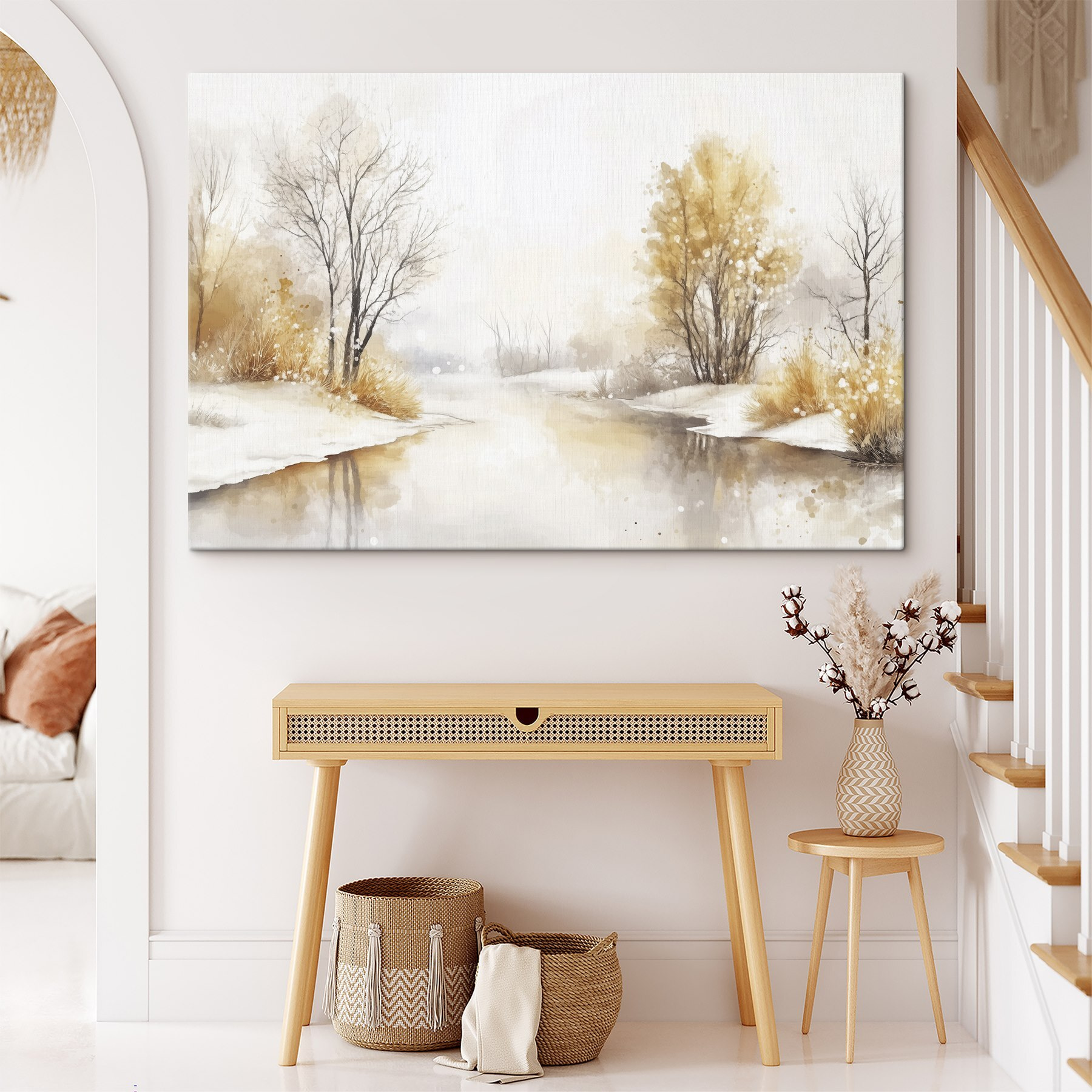 Imaginez que vous vous installiez dans un coin tranquille, un café à la main, et que vous laissiez vos yeux se promener sur cette superbe aquarelle représentant une rivière. C’est comme entrer dans un doux rêve où les arbres se balancent doucement et où la neige murmure des secrets. Les tons chauds de la terre se mêlent sans effort aux blancs et gris froids, créant une ambiance sereine qui évoque ces jours d’hiver où l’on a envie d’hiberner. Parfaite pour ajouter une touche de calme naturel à n’importe quel espace, cette pièce pourrait bien être l’évasion tranquille dont vous ne saviez pas que vous aviez besoin. Croyez-moi, c’est un joli petit rêve éveillé sur votre mur !