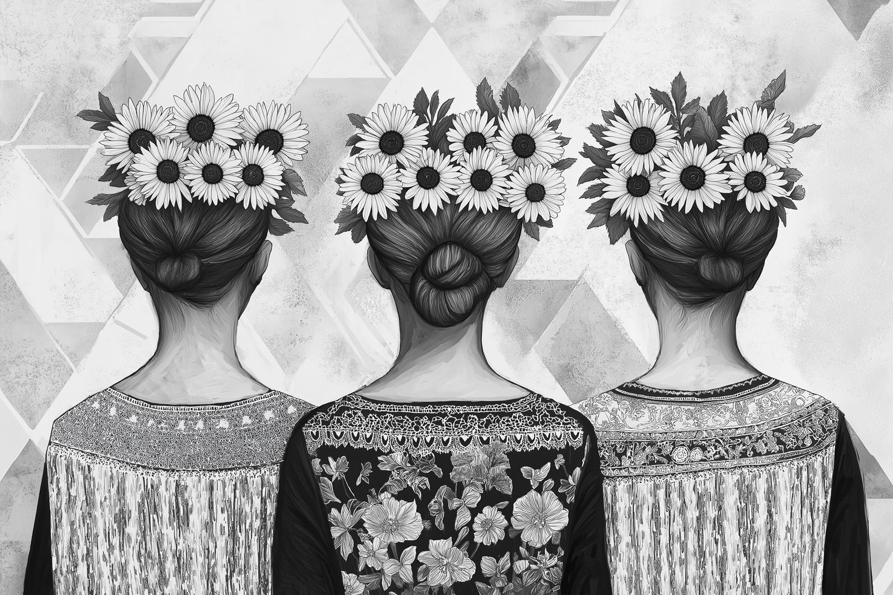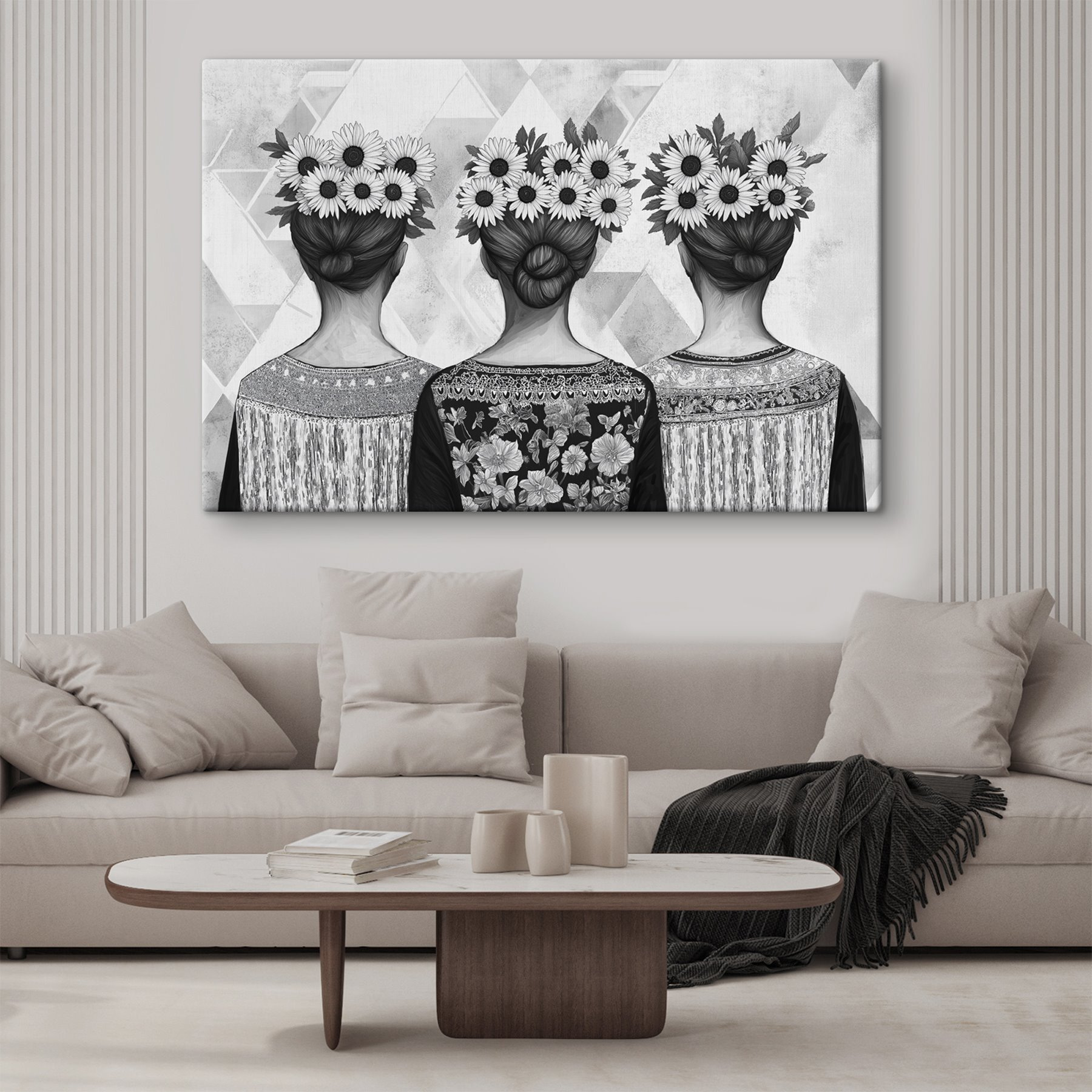 Illuminez n’importe quelle pièce avec cette superbe impression sur toile représentant un trio de femmes parées de belles fleurs dans leurs cheveux. C’est comme une explosion de joie de la nature qui rappelle les promenades ensoleillées dans les jardins fleuris. Les détails délicats de leurs vêtements et de leurs couronnes florales offrent un beau contraste avec la toile de fond chic et moderne, parfaite pour ajouter une touche de charme à un salon ou à un coin douillet.