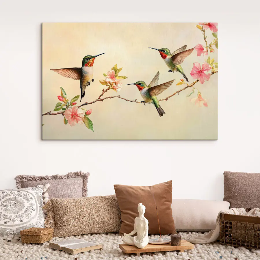 Imaginez une journée ensoleillée, des colibris voletant joyeusement, leurs petites ailes créant un doux bourdonnement. Cette impression sur toile capture ce moment délicieux, mettant en scène un charmant trio de ces petites merveilles perchées sur une délicate branche ornée de jolies fleurs. Parfaite pour égayer n’importe quelle pièce, elle invite à la sérénité et à une touche de nature à l’intérieur. Chaque fois que quelqu’un passe devant, c’est comme s’il assistait à une danse magique, et qui n’a pas besoin d’un peu de fantaisie ? Faites entrer l’extérieur à l’intérieur et laissez ces oiseaux vibrants susciter la joie et l’émerveillement dans la vie de tous les jours.