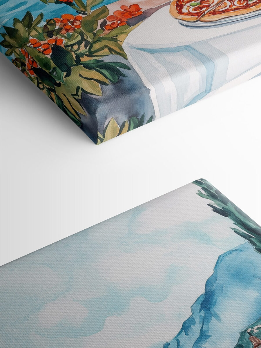 Imaginez : une scène paisible au bord d’un lac, une table dressée pour un délicieux repas garni d’une pizza alléchante et de boissons rafraîchissantes. Cette aquarelle capture ce moment parfait. Elle invite tous ceux qui la voient à rêver d’après-midi ensoleillés, de rires partagés autour de tranches de pizza et du doux balancement des arbres au soleil. Sentez les bleus sereins du lac et les montagnes en arrière-plan, comme un lieu de vacances dans votre maison. Ce n’est pas seulement de l’art, c’est un billet pour la tranquillité, ce qui en fait un ajout charmant à n’importe quel mur. Parfait pour ceux qui adorent les décors uniques !