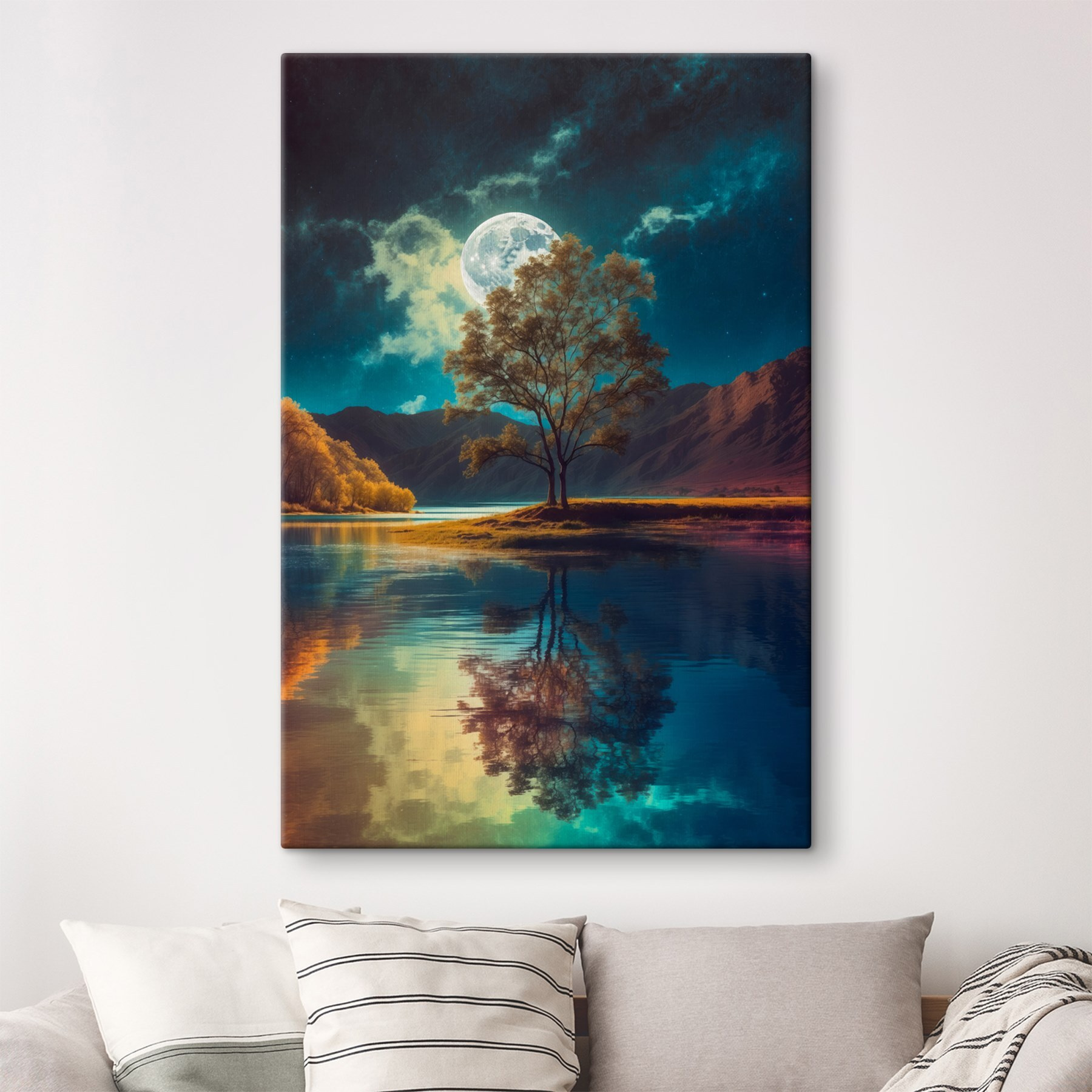 Imaginez une nuit sereine au bord de l’eau, où un arbre solitaire se dresse fièrement sous la lueur d’une lune géante. C’est l’ambiance qu’apporte à votre espace l’œuvre “Tableaux Tree on the Water” (Impression sur toile – Arbre sur l’eau). Ses teintes douces et ses reflets saisissants vous invitent à faire une pause et à respirer profondément, ce qui est parfait pour les moments où la vie devient un peu trop trépidante. C’est comme si vous apportiez un morceau de nature paisible à l’intérieur, sans les insectes. Accrochez-le dans votre salon et vous vous retrouverez perdu dans vos pensées, peut-être même en train de rêver d’escapades au bord d’un lac. Une touche de calme, un murmure de magie – un véritable coup de cœur !