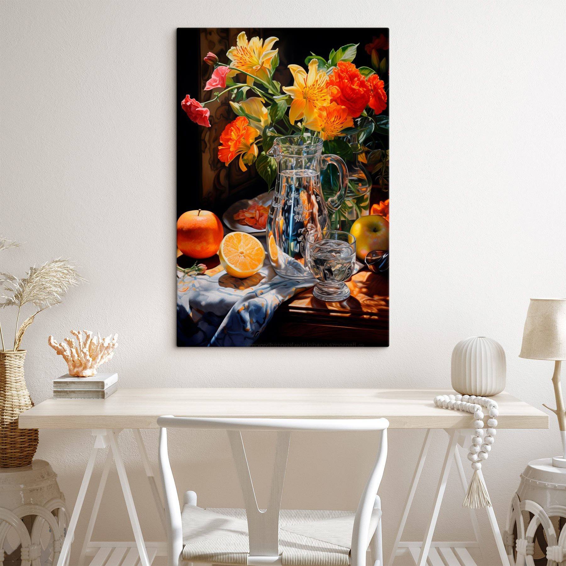 Ajoutez du piquant à votre espace avec cette impression sur toile “Nature morte aux fleurs et aux fruits”. C’est comme une petite tranche de nature, débordant de couleurs qui peuvent faire sourire n’importe qui. Imaginez les doux pétales et les fruits juteux qui vous invitent à prendre une collation. Le reflet dans le pichet en verre donne une impression de vie à toute la scène, comme si vous pouviez entendre le doux tintement des glaçons contre le verre. Parfaite pour les salons ou les cuisines, cette œuvre d’art apporte une ambiance chaleureuse et accueillante à n’importe quel mur. Plus qu’un simple décor, c’est un rappel quotidien à s’arrêter, à sentir les fleurs et à apprécier les joies simples de la vie. De plus, qui ne voudrait pas d’une touche florale ? Accrochez-le, servez-vous un verre et profitez de la vue !