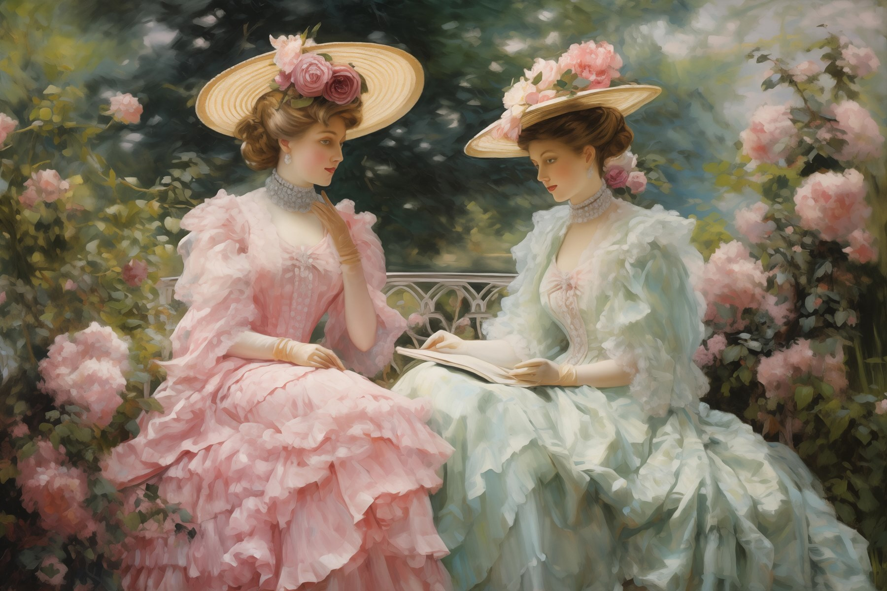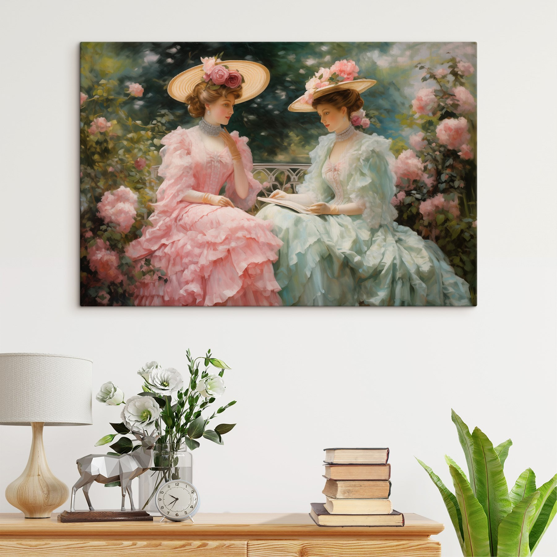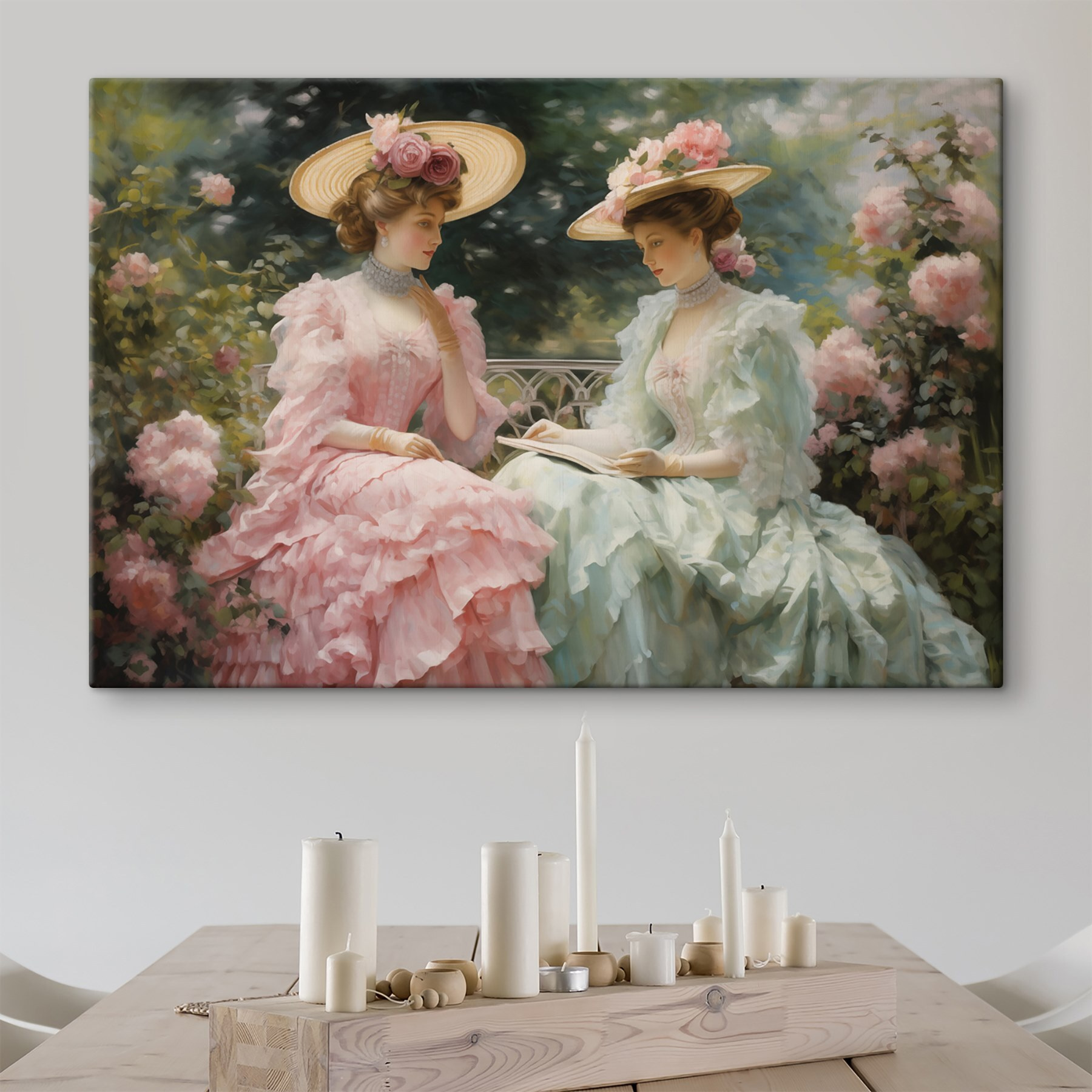 Entrez dans un monde d’élégance avec cette superbe impression sur toile représentant deux femmes vêtues de belles robes et de chapeaux surdimensionnés. Imaginez le doux bruissement de leurs robes alors qu’elles sont assises au milieu de roses en fleurs, plongées dans un moment de grâce intemporelle. Cette œuvre d’art apporte une touche de charme vintage et une bouffée d’air frais à n’importe quel espace. C’est comme si vous invitiez un jardin de printemps dans votre maison ! Parfaite pour égayer un salon ou donner du cachet à un coin lecture douillet, cette œuvre murmure des histoires d’après-midi paisibles et de pique-niques ensoleillés. Préparez-vous à recevoir des compliments qui couleront comme du thé sucré lors d’un rassemblement estival !
