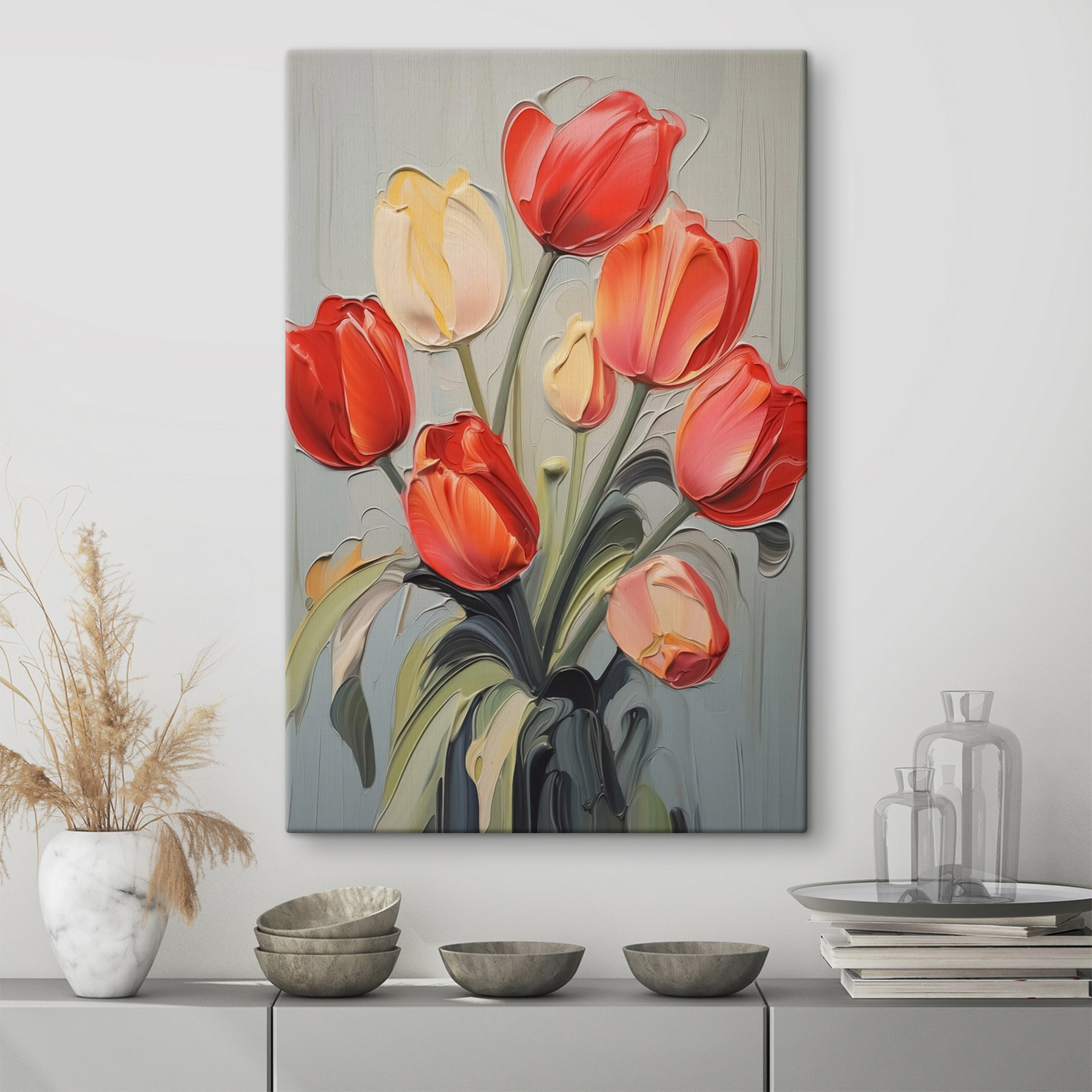 Illuminez un coin terne avec cette superbe impression sur toile de tulipes vibrantes sur un fond gris calme. Ces jolies fleurs apportent une touche de couleur qui donne l’impression que le printemps est toujours dans l’air. Sérieusement, qui a besoin d’un jardin quand on peut avoir de l’art ? Imaginez que vous entrez dans une pièce, que vous apercevez ces pétales enjoués et que vous sentez instantanément votre humeur s’améliorer. C’est comme avoir un jardin secret qui ne se fane jamais. Parfait pour le salon, ou même pour ce mur vide dans le couloir qui ne demande qu’à être aimé. S’épanouir là où l’on est planté, n’est-ce pas ?