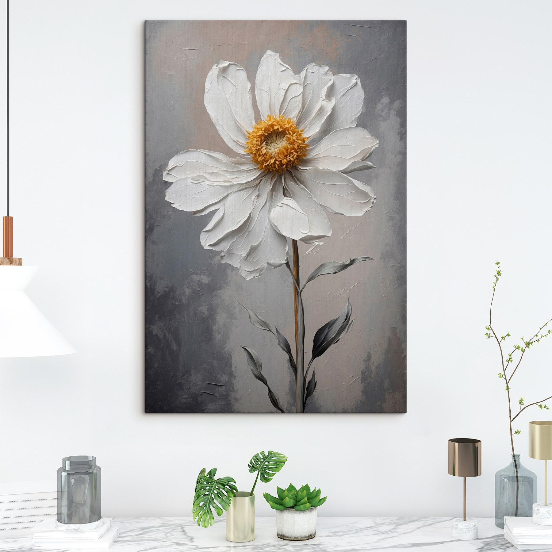 Illuminez n’importe quel coin terne avec cette superbe impression sur toile d’une fleur blanche dont le centre est d’un jaune joyeux. C’est comme si vous apportiez un petit morceau de nature à l’intérieur sans avoir à vous soucier de l’arroser ! Imaginez-la suspendue dans un salon confortable ou au-dessus d’un coin lecture serein. Chaque fois que quelqu’un passe à proximité, il peut faire un double regard, pensant qu’il s’agit d’une fleur fraîche ! Les tons doux de l’arrière-plan renforcent son charme et lui permettent de s’intégrer parfaitement à différents styles de décoration. C’est une belle façon de susciter la conversation et d’égayer l’ambiance. Alors n’hésitez pas, laissez cette beauté florale ajouter une touche de vie à votre espace !