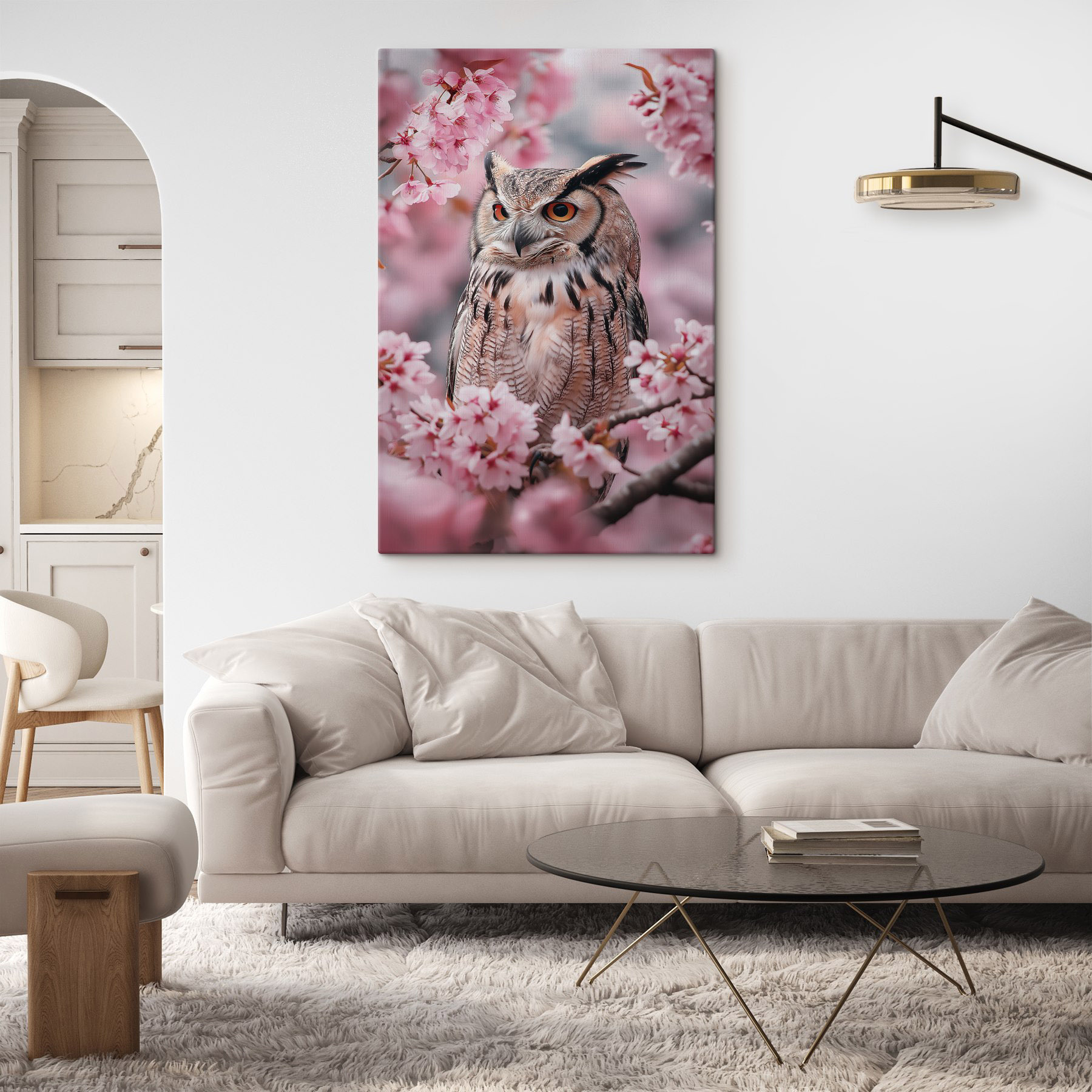 Apportez une touche de fantaisie à n’importe quelle pièce avec cette superbe impression sur toile représentant un hibou perché gracieusement parmi de délicates fleurs roses. C’est comme si le petit secret de la nature se révélait sur votre mur. Imaginez-vous confortablement installé avec une tasse de café, et le voilà, un ami sage qui vous observe, les yeux pleins de charme et de curiosité. Cette œuvre apporte une touche de couleur et un soupçon de nature sauvage, parfaite pour égayer un couloir ou ajouter de la magie à un salon. Ce n’est pas seulement un élément de décoration, c’est aussi un sujet de conversation ! Chaque regard pourrait vous rappeler d’apprécier la beauté qui vous entoure. Qui ne sourirait pas devant un hibou volant la vedette au milieu des fleurs ?