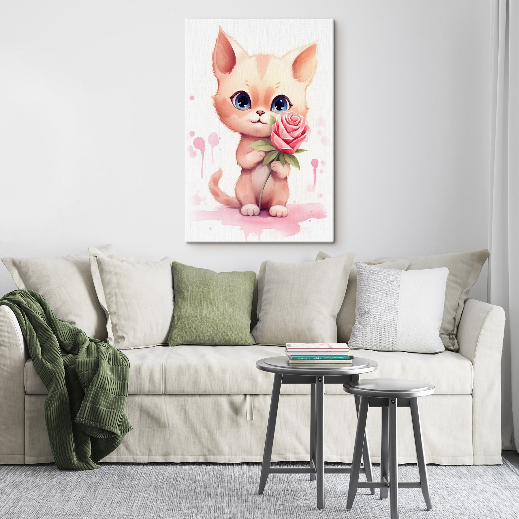 Voici une ravissante impression sur toile : un charmant petit chat tenant une fleur éclatante, prêt à apporter une touche de joie et de fantaisie à n’importe quel espace. Imaginez cette adorable créature perchée sur votre mur, ajoutant de la chaleur et une touche d’espièglerie. C’est comme avoir un ami à quatre pattes qui sait toujours vous remonter le moral, sans avoir besoin de litière ! Les couleurs vives vous feront sourire, tandis que son expression douce et attendrissante vous séduira. Idéal pour égayer un coin confortable ou un couloir terne. Accrochez-le à un endroit où vous le verrez tous les jours et laissez-le illuminer votre quotidien. Décorez votre maison avec cette œuvre enchanteresse et voyez les sourires apparaître !