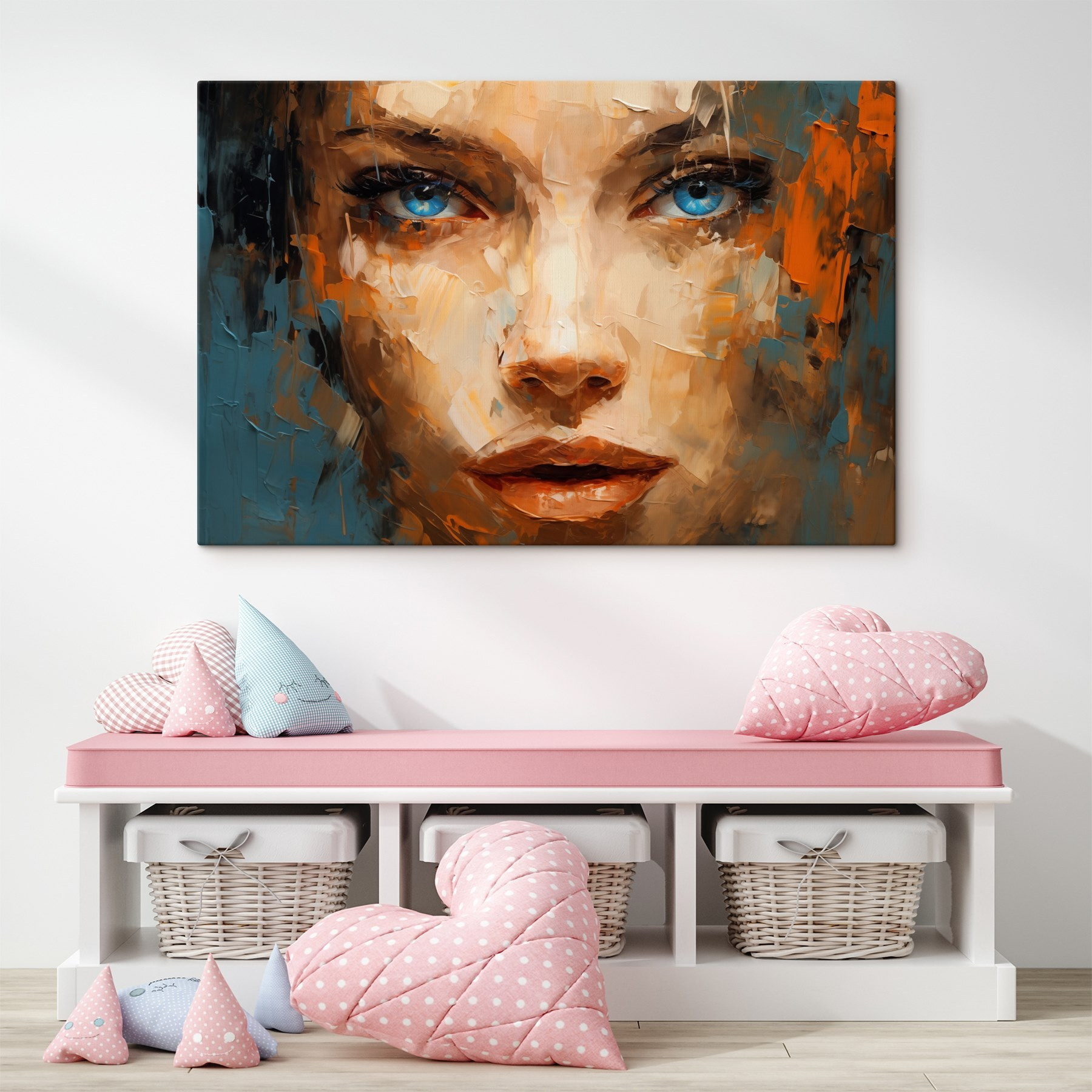 Diving into this canvas print is like peering into a beautiful enigma. The painting of a woman’s face isn’t just art; it’s an invitation to feel and explore. Those striking blue eyes draw you in, hinting at stories untold and emotions just under the surface. The playful splashes of color create a vibrant rhythm, bringing life to any space. Imagine it in a cozy nook or above a sleek sofa—it’s bound to spark conversations and maybe even a few daydreams. Perfect for those who love unique decor that has a heartbeat. A little bit mesmerizing, a little bit mysterious—this piece might just make you stop and stare (in the best possible way).