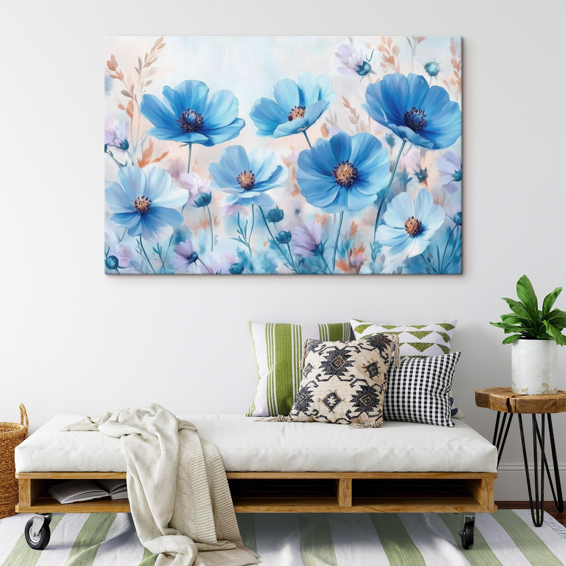 Égayez n’importe quel espace avec cette superbe « impression sur toile Groupe de fleurs bleues ». Imaginez-vous entrer dans une pièce et être accueilli par une brise fraîche de fleurs bleues dansant doucement sur un fond pastel. C’est comme un petit coin de nature, sans le pollen !