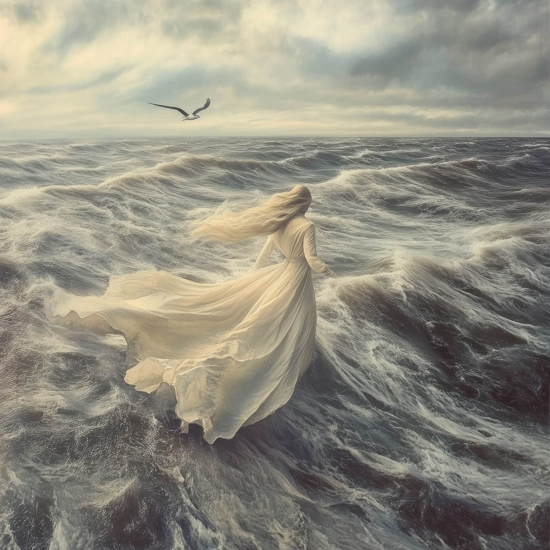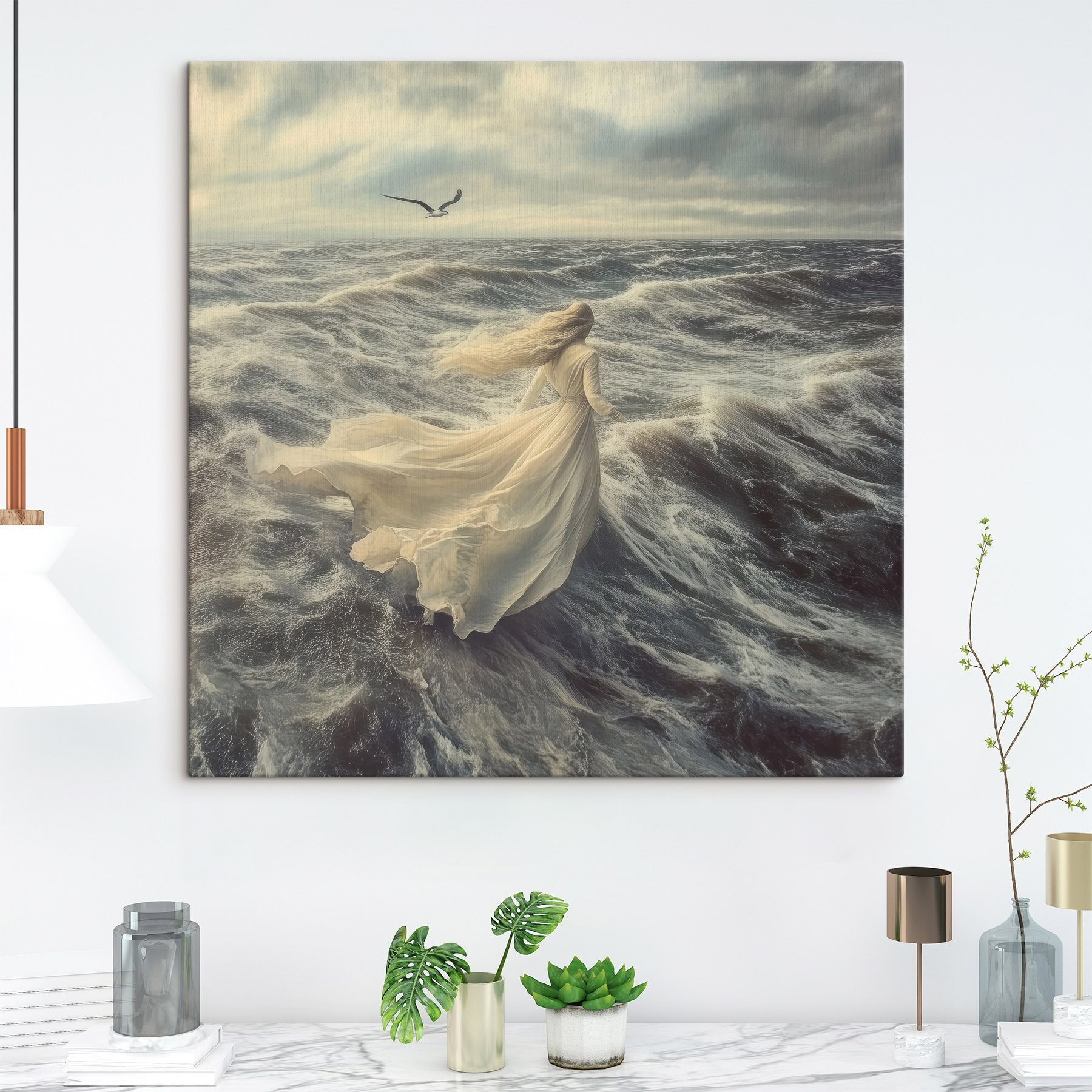 Imaginez une scène où le vent ébouriffe vos cheveux et où la mer caresse vos orteils : c’est exactement ce que représente cette toile imprimée ! Intitulée « Femme en robe blanche courant sur les vagues », elle capture ce moment magique où la liberté rencontre la nature. Le tissu doux et fluide semble danser avec l’océan, tandis que les vagues tourbillonnent dans un magnifique chaos.