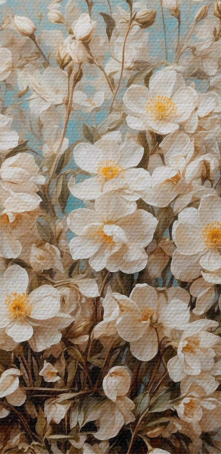 Les fleurs d’un blanc tendre se détachent sur un fond paisible, créant un sentiment de calme. C’est comme si vous aviez un petit jardin chez vous, sans avoir besoin d’avoir la main verte. Accrochez-le au-dessus d’un coin lecture confortable ou dans un couloir lumineux, et soudain, l’espace se sentira vivant. Qui aurait cru que l’art pouvait murmurer une si douce simplicité ? Parfait pour les amoureux des fleurs, ou pour tous ceux qui cherchent à rehausser leur décoration d’une touche d’élégance.