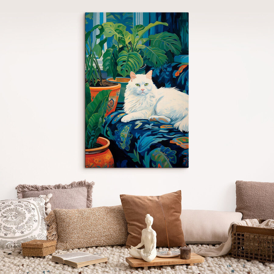 Meet the canvas print that’s about to catapult your living space into a cozy retreat—”Cat Lying on a Couch.” This beaut captures a fluffy feline just chillin’ on a vibrant couch, surrounded by lush plants. It’s like a little slice of calm and whimsy, perfect for brightening up any corner. Imagine coming home after a long day, flopping onto the couch, and being greeted by this serene scene. It’s like having a furry friend there, minus the shedding! Plant lovers will adore the splashes of green, too. Perfect for anyone who’s got a soft spot for pets or just wants to add a touch of cozy charm.