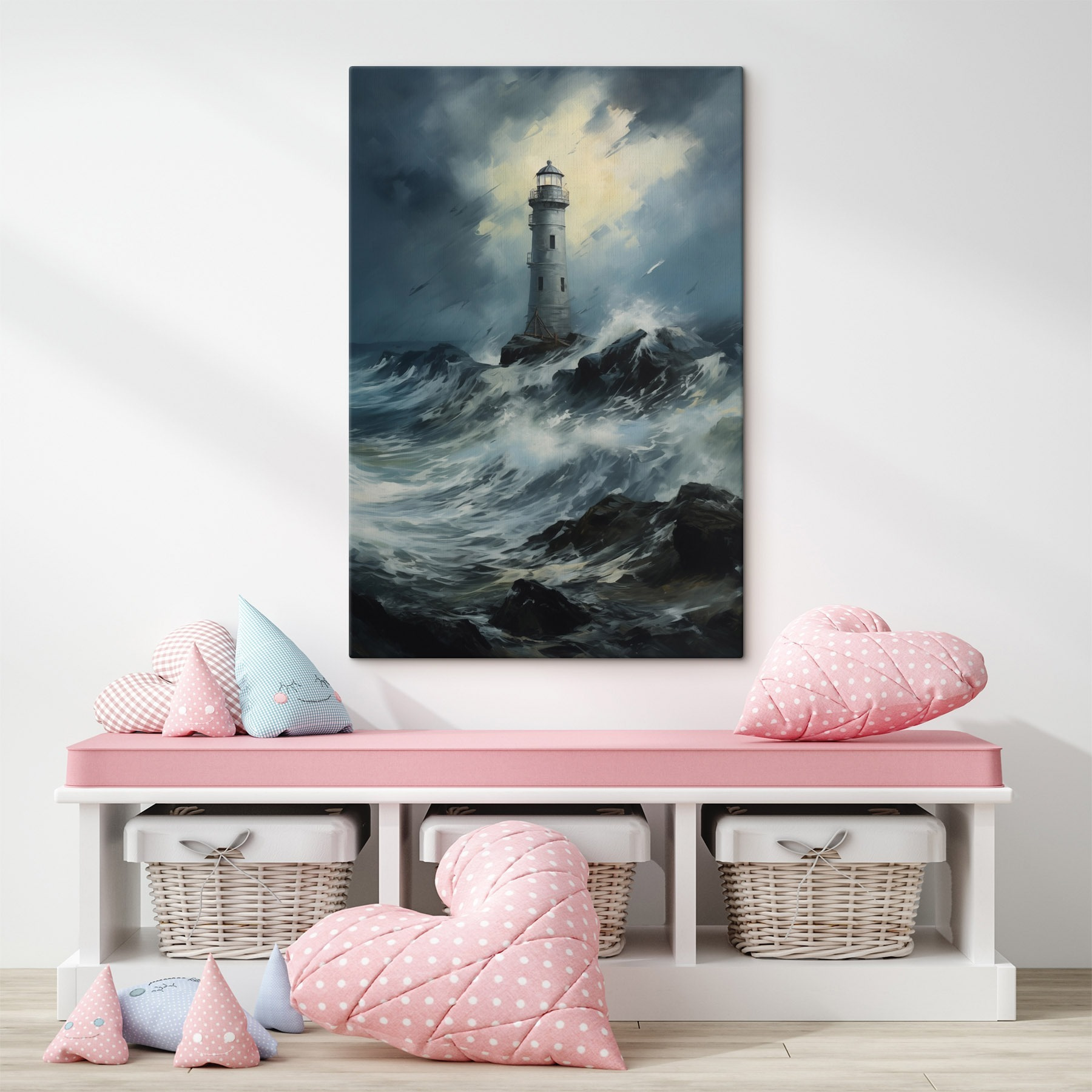 Imagine this stunning lighthouse bravely standing tall against crashing waves, guiding lost ships home. It’s more than just art; it captures a feeling of adventure, mystery, and a sprinkle of the ocean’s wildness. Placing this canvas on your wall is like inviting a piece of the sea into your space. Friends might stop and say, “Wow, where did you find that?” And you can simply smile, knowing you added a dash of coastal magic to your decor. Perfect for beach lovers or anyone needing a reminder of nature’s beauty. Who wouldn’t feel inspired by those stormy skies and the lighthouse’s determined glow? It’s a daily adventure right at home!