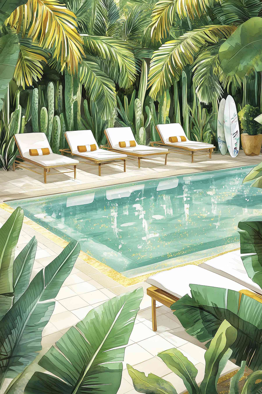 Entrez dans un paradis de brise avec cette impression sur toile qui capture une scène de piscine sereine. Imaginez ces chaises longues confortables, qui n’attendent que quelqu’un pour se détendre, siroter une boisson fraîche et profiter du soleil. Des planches de surf se trouvent à proximité, prêtes pour des aventures spontanées. Il ne s’agit pas seulement d’une scène, mais d’une ambiance. La verdure luxuriante apporte une touche de vie, enveloppant l’espace dans l’étreinte de la nature. Imaginez comment cette œuvre d’art peut donner à n’importe quelle pièce l’impression d’être un lieu de vacances, invitant à la détente et aux rêveries ensoleillées. Parfait pour apporter une touche de joie et d’extérieur à l’intérieur !