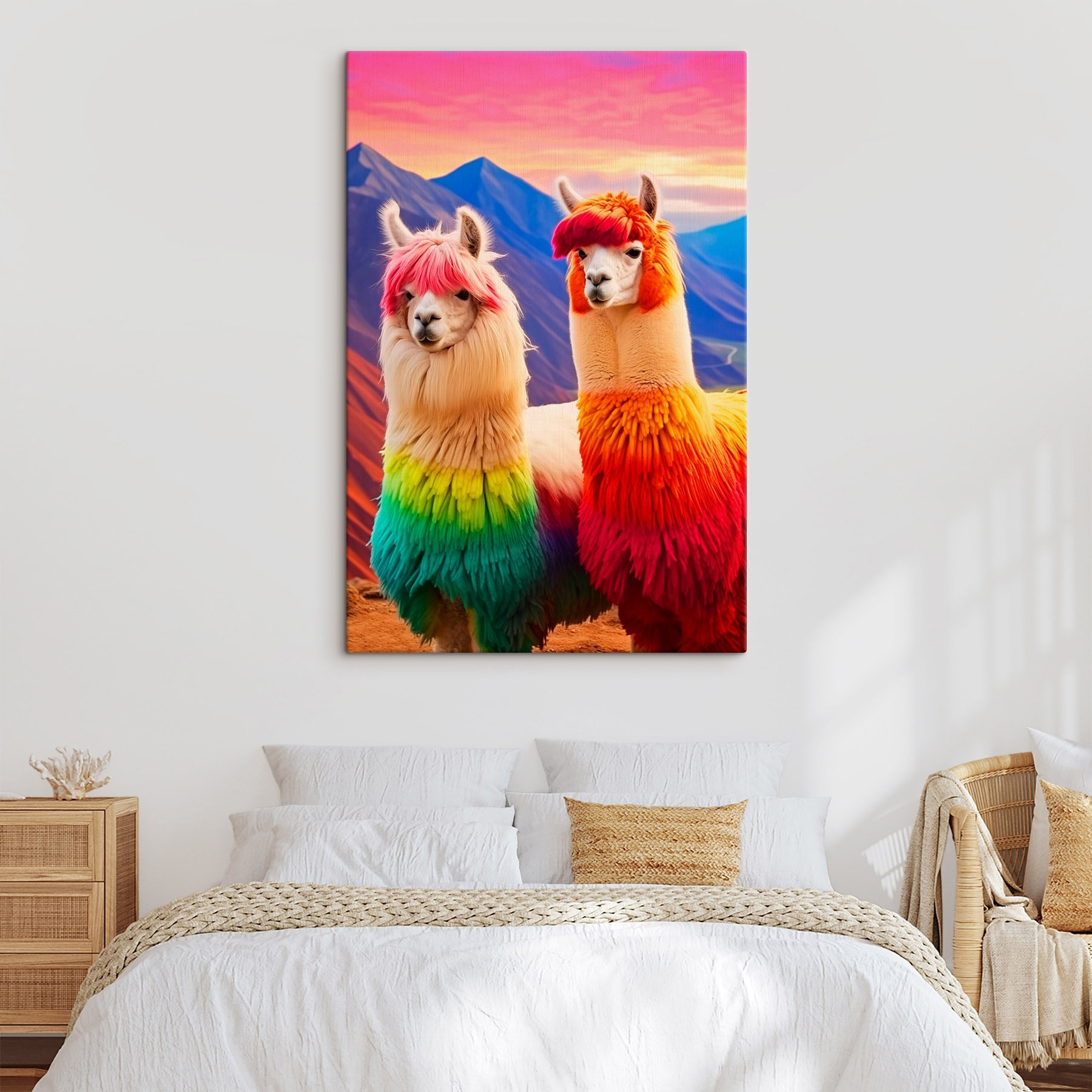Illuminez n’importe quelle pièce avec cette impression sur toile excentrique représentant deux lamas arborant une chevelure vibrante aux couleurs de l’arc-en-ciel. Ces créatures pleines de vie apportent une touche fantaisiste à votre mur, parfaite pour les amoureux des animaux ou tous ceux qui cherchent à ajouter une touche de couleur à leur décor. Imaginez que vous entrez dans votre espace et que vous êtes immédiatement accueilli par leurs visages joyeux. C’est comme si vous aviez un animal de compagnie joyeux qui n’a pas besoin d’être nourri ou promené ! Que ce soit dans un salon confortable ou une salle de bricolage amusante, cet imprimé apporte des sourires et des sujets de conversation. Ces lamas sont prêts à animer votre atmosphère !