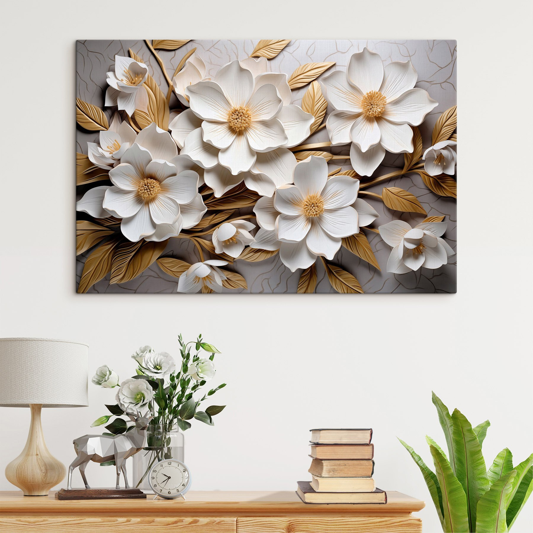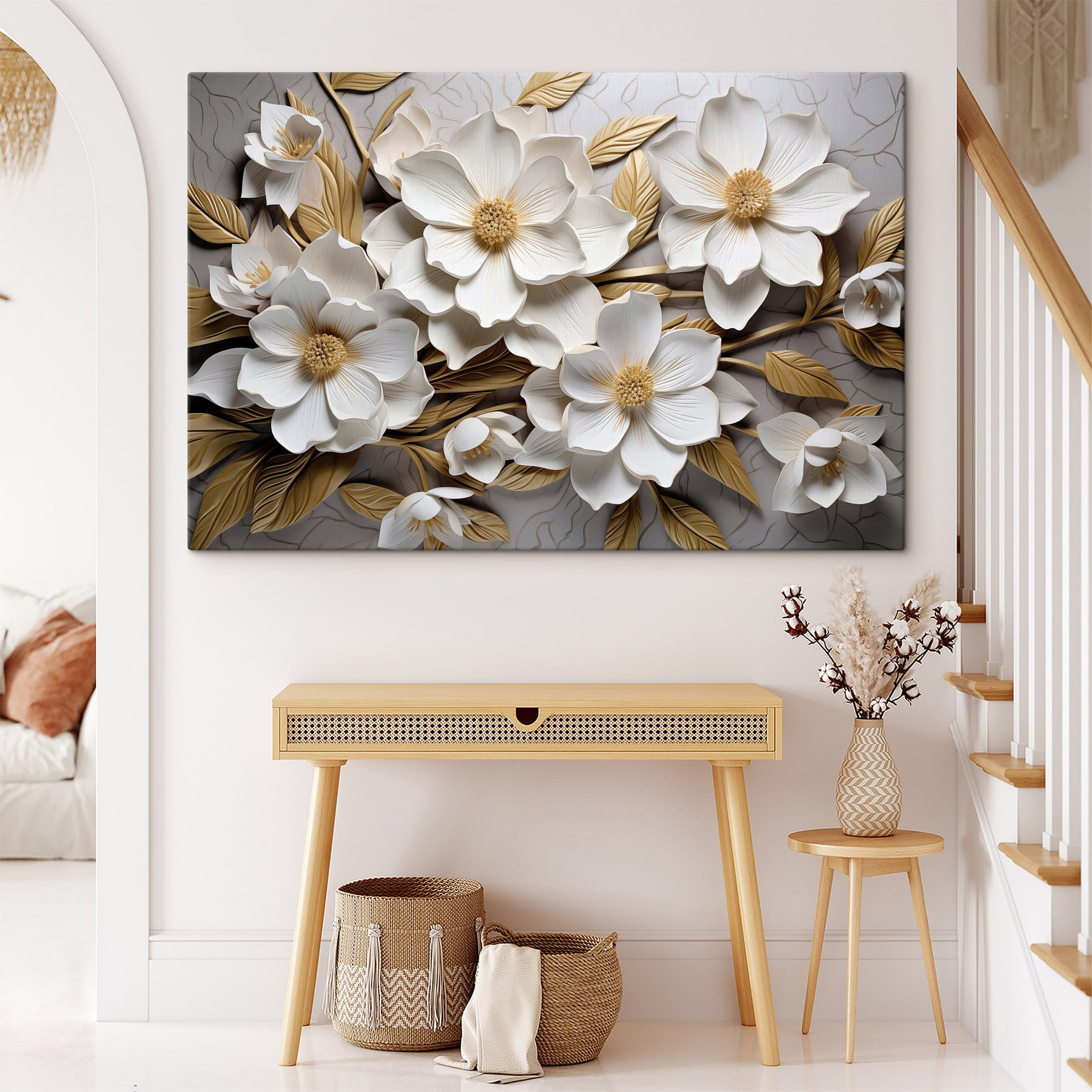 Illuminez n’importe quelle pièce avec cette charmante impression sur toile représentant un groupe de fleurs blanches et des accents feuillus. C’est comme si vous aviez un petit jardin sur votre mur, sans l’arrosage et les insectes nuisibles ! Les couleurs douces et élégantes apporteront une touche de fraîcheur et rendront les espaces chaleureux et accueillants. Imaginez-vous en train de siroter un café ou de vous blottir dans un livre sous son doux regard. Il est parfait pour ceux qui adorent la beauté de la nature mais qui n’ont pas la main verte. Ajoutez un soupçon de joie florale à votre maison et vous verrez qu’elle transformera votre ambiance. Qui n’aime pas un peu de gaieté dans son décor ?
