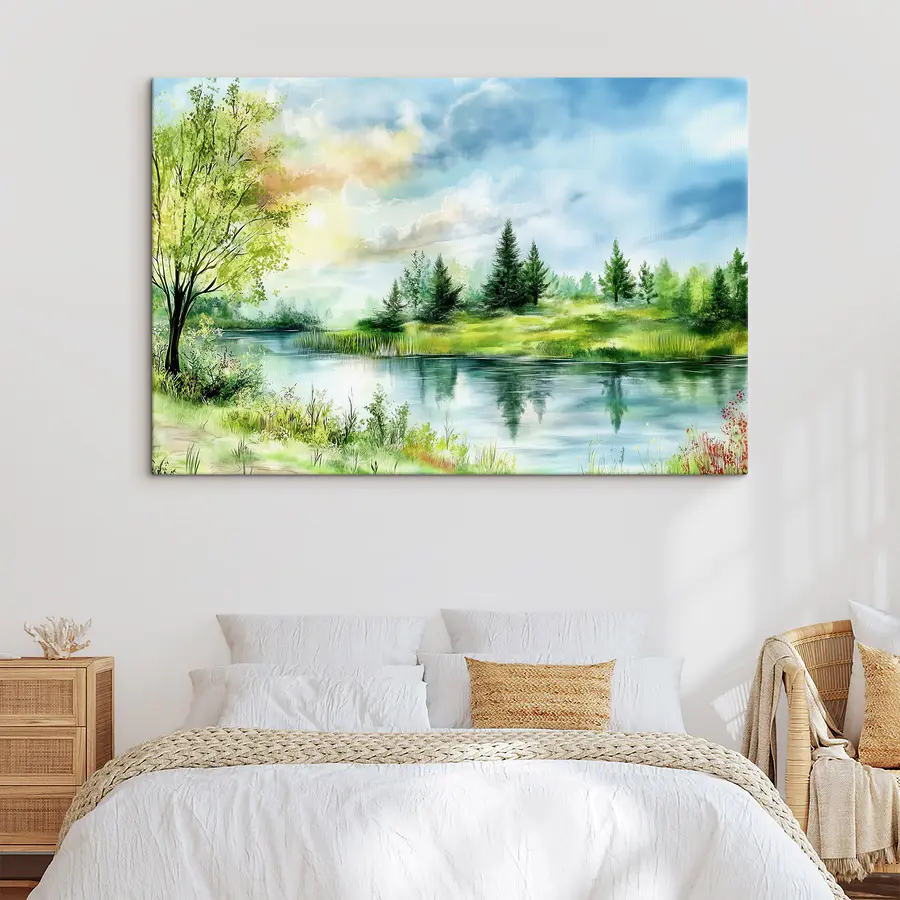 Transformez n’importe quelle pièce en une évasion sereine grâce à cette jolie aquarelle. Imaginez un lac paisible, doucement entouré d’arbres se balançant et d’herbes luxuriantes, baigné d’une lumière douce et rêveuse. C’est comme des mini-vacances sur vos murs, invitant à des moments de réflexion douillets. Qu’il soit suspendu au-dessus d’un canapé confortable ou dans un coin lecture, il suscite des rêves d’après-midi paresseux passés au bord de l’eau. Les couleurs vives peuvent remonter le moral et donner de la vie à un espace terne. Qui n’aurait pas envie de rentrer à la maison avec cette tranche de nature radieuse ? Ajoutez de la gaieté, de la chaleur et peut-être même un peu d’aventure à votre décor.