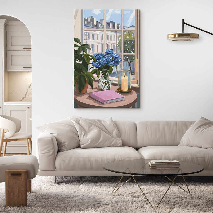 Illuminez n’importe quel espace avec cette délicieuse impression sur toile représentant un vase de fleurs bleues vibrantes et une bougie vacillante, le tout encadré par le charme d’une vue sur une fenêtre. Imaginez-vous en train de vous blottir contre une tasse de thé chaude, en sentant une douce brise pénétrer dans la pièce tandis que la lumière du soleil danse à travers la pièce. C’est comme si vous faisiez entrer une petite partie d’un café confortable dans votre maison. Parfait pour un salon, un bureau ou même un coin tranquille où l’inspiration afflue. Ajoutez cette pièce et laissez la joie des fleurs fraîches et de la lumière des bougies susciter de jolis moments dans la vie de tous les jours.