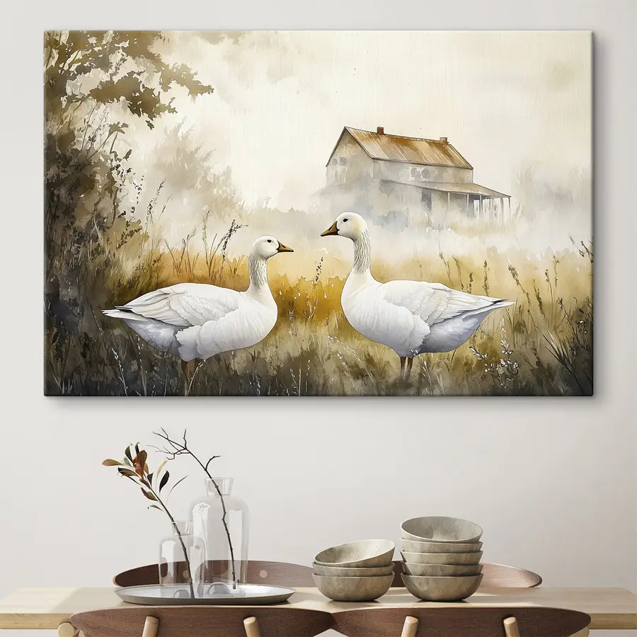 Imaginez deux oies se tenant ensemble dans un champ serein, discutant tranquillement, tandis que la nature murmure en arrière-plan. Cette aquarelle capture ce calme parfait, ce qui en fait un ajout charmant à n’importe quel espace. Les couleurs douces créent une ambiance chaleureuse, parfaite pour un salon ou un couloir. C’est comme si vous apportiez une tranche de nature à l’intérieur sans la boue ! Imaginez que vous sirotez un thé en profitant de la vue – ces amis à plumes pourraient même vous inspirer un sourire. Parfait pour les amoureux des animaux ou toute personne cherchant à ajouter une touche de beauté tranquille à son décor. C’est adorable, captivant et tellement paisible.