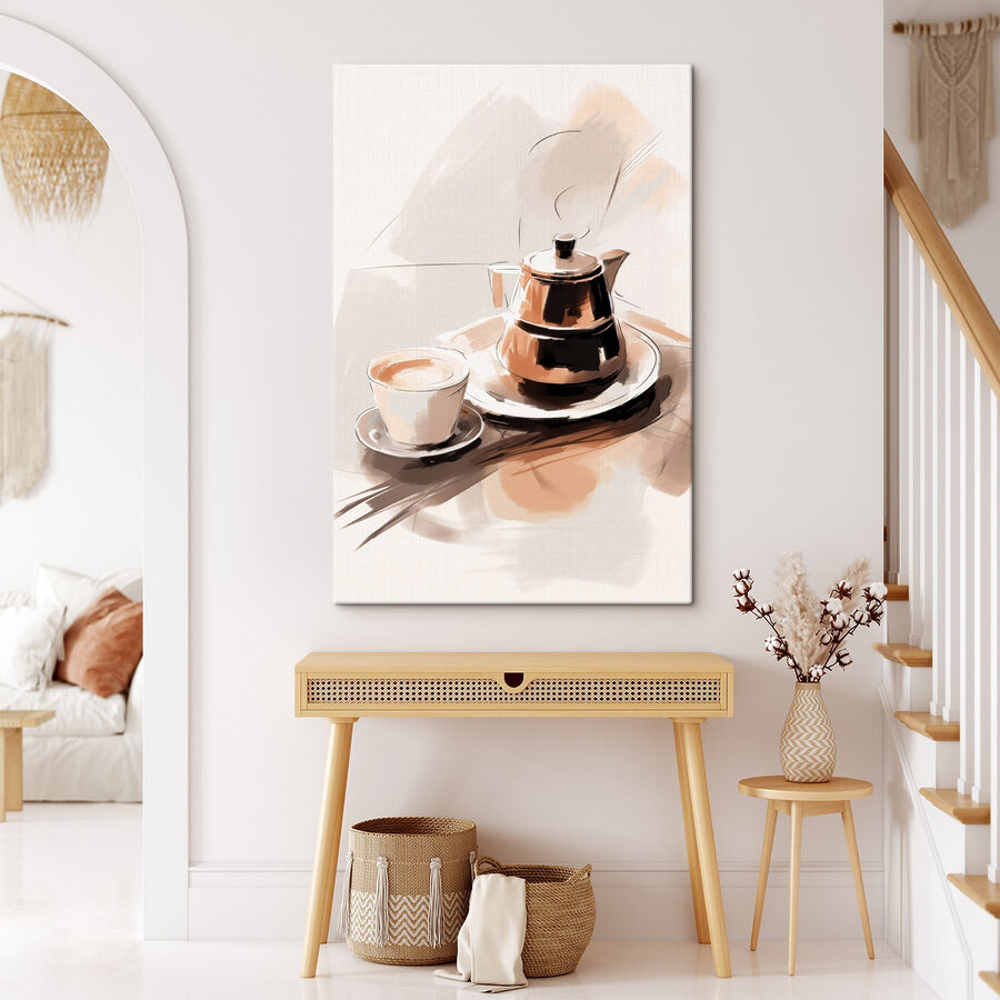 Apportez une touche de charme douillet à vos murs avec cette ravissante impression sur toile. Une théière et une tasse, élégamment posées sur une assiette, constituent une invitation intemporelle à la détente. Imaginez : vous sirotez votre boisson préférée tout en discutant avec des amis, les rires emplissent la pièce et cette pièce sert de toile de fond parfaite. Le design doux et minimaliste s’intègre à tous les décors et illumine instantanément votre espace sans attirer l’attention. Ce n’est pas seulement de l’art, c’est aussi une source d’inspiration, une invitation à la conversation et peut-être un rappel subtil de se détendre et d’apprécier les petits moments de la vie. Parfait pour les cuisines, les salles à manger ou tout autre coin douillet qui a besoin d’un peu de chaleur !