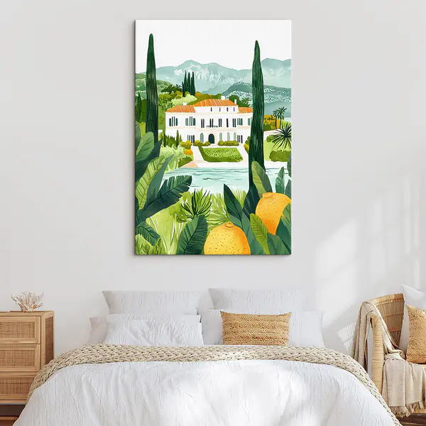 Tableaux Peinture d’un bâtiment avec un arbre et des fleurs